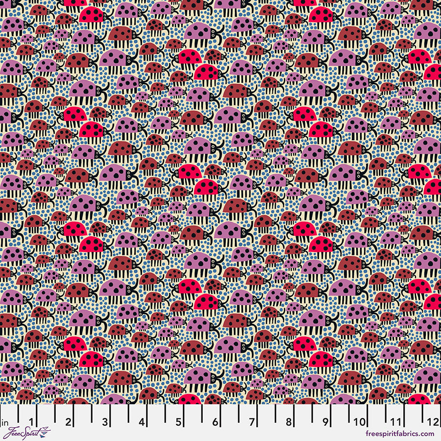 This cotton fabric by Monika Forsberg features a parade of ladybugs in purple, red, and chocolate brown.