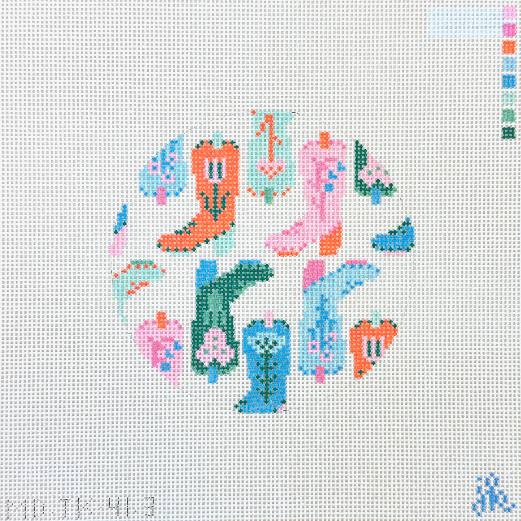This is a hand painted needlepoint canvas by Jenny Koland from Mopsey Designs featuring colorful cowboy boots.