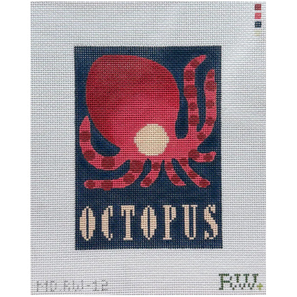 This is a hand painted needlepoint canvas by Rachel Westhead Designs for Mopsey Designs. It features an octopus at the center against a yellow background, with the text "Octopus" below it.