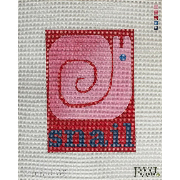 This is a hand painted needlepoint canvas by Rachel Westhead Designs for Mopsey Designs. It features a pink snail at the center, with the text "Snail" below it.