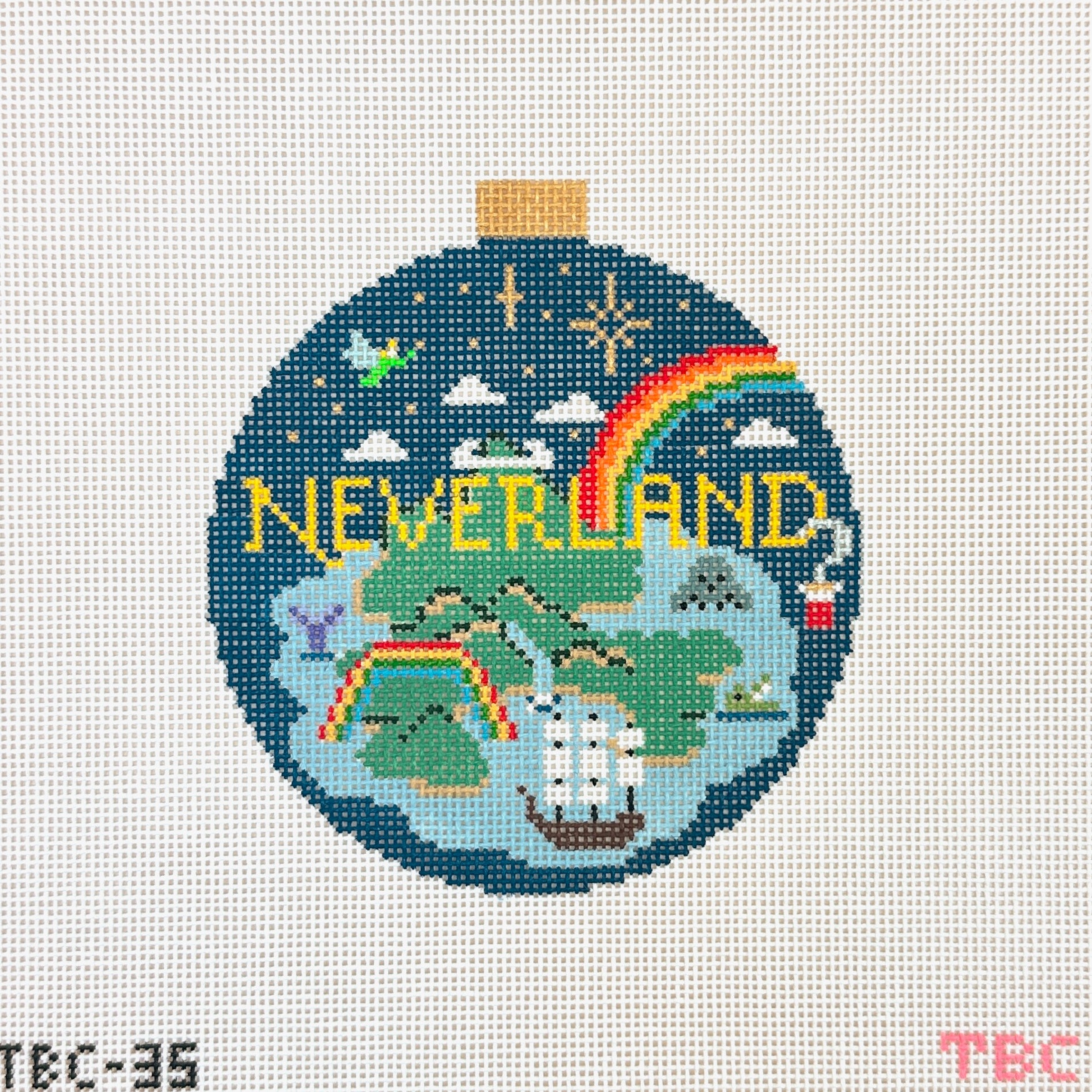 This is a hand painted needlepoint canvas by The Book Canvas from Mopsey Designs featuring iconography from Peter Pan.