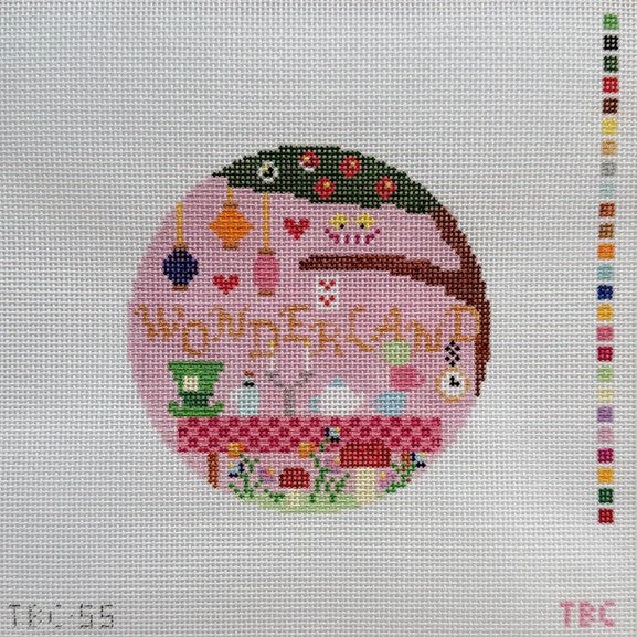 This is a hand painted needlepoint canvas by The Book Canvas for Mopsey Designs. It features motifs from "Alice in Wonderland", with the text "Wonderland" across the center.