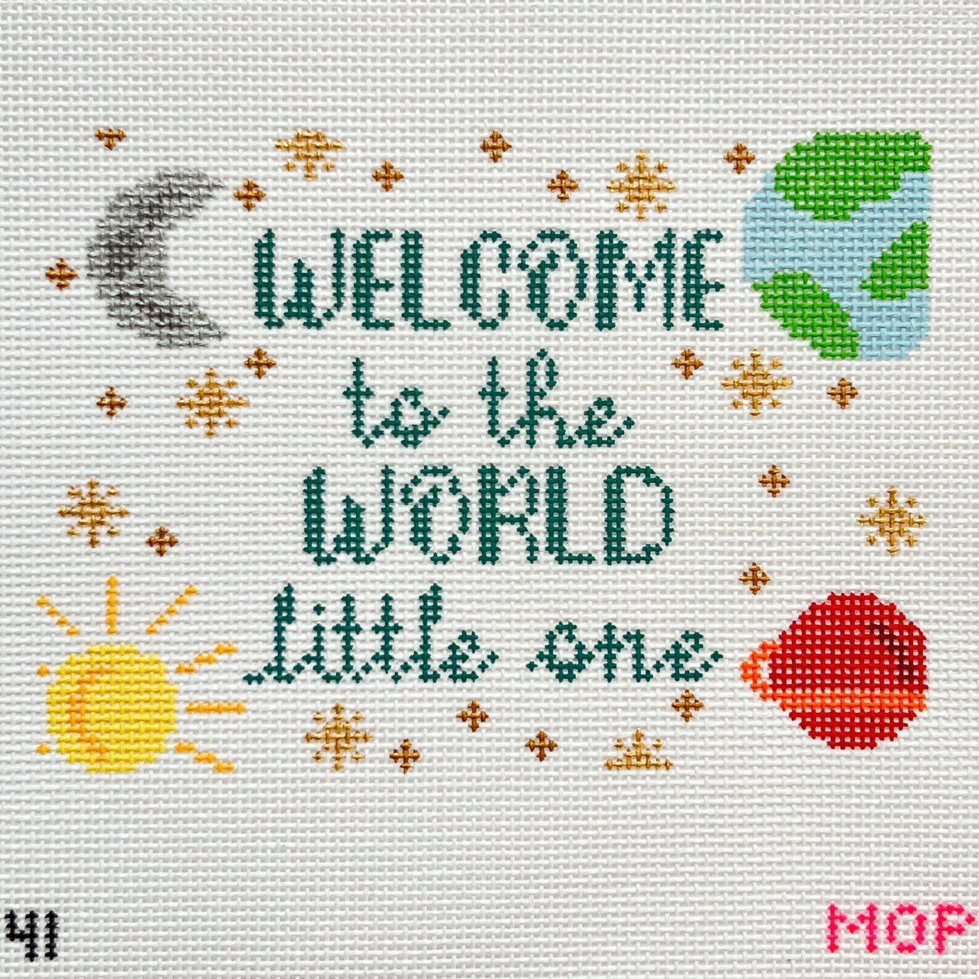 This hand painted needlepoint canvas from Mopsey Designs features the cosmos with "Welcome to the World" for new babies.