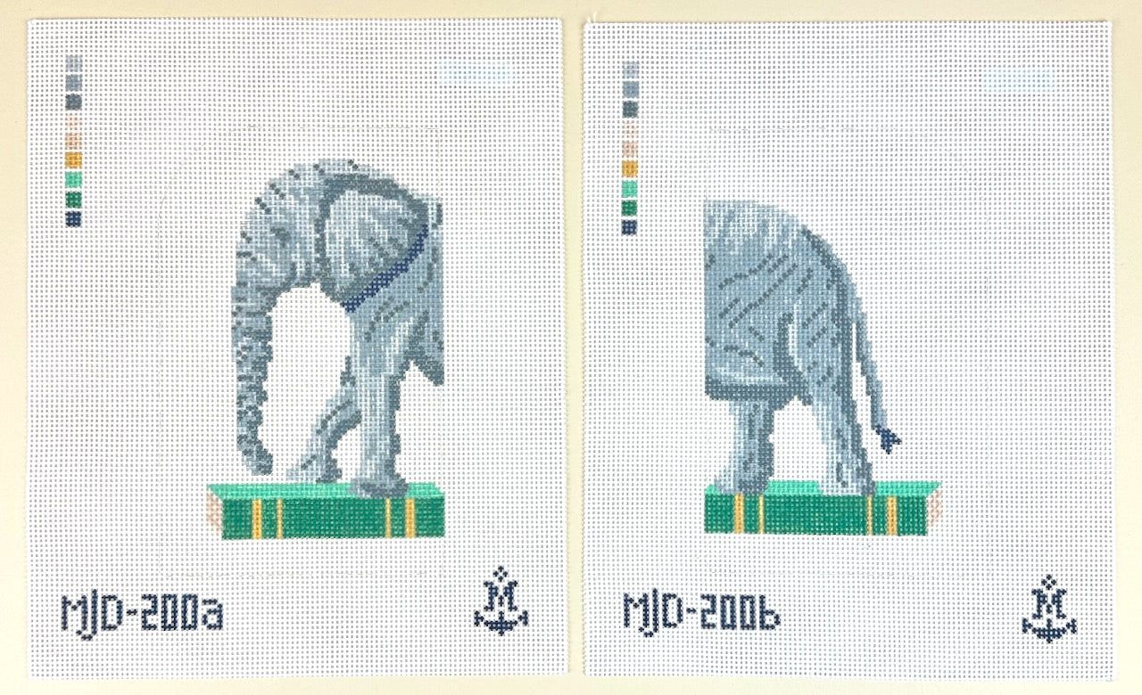 These are two hand painted needlepoint canvases from Morgan Julia Designs, which feature the front and back half of an elephant walking along a book. This is a great canvas for adding some whimsy to a bookshelf or cabinet. The mesh size and measurements for each canvas are the same. When put together, the elephant measures about 8.5 x 14 inches.