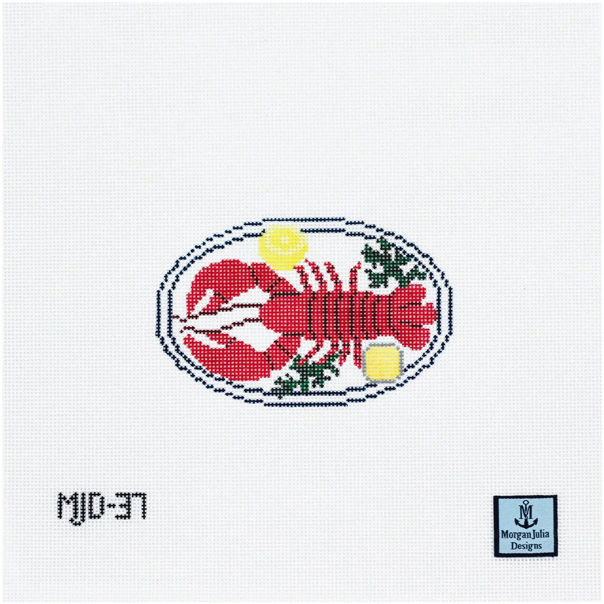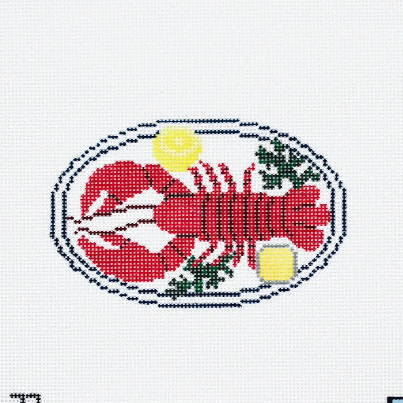 This is a hand painted needlepoint canvas by Morgan Julia Designs. It features a tasty looking plated lobster, served with lemon and butter.