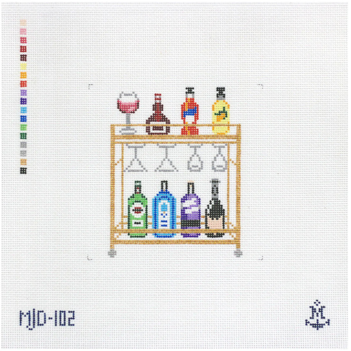 This is a hand painted needlepoint canvas by Morgan Julia Designs. It features an arrangement of rainbow-colored bottles on a gold bar cart, with small corner markings to denote the 4.5 x 4.5 inch stitching area.