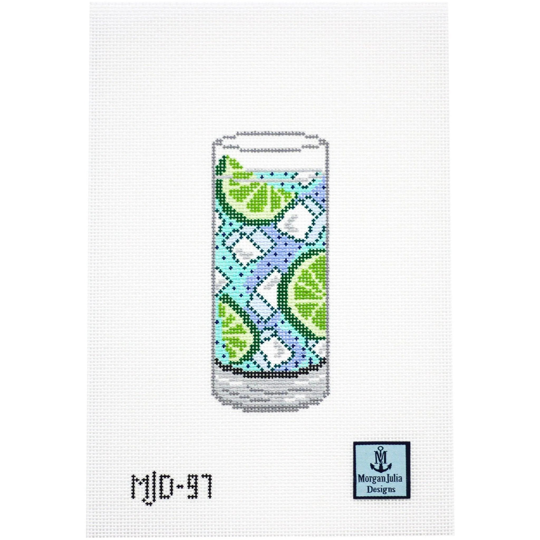 This hand painted needlepoint canvas by Morgan Julia features a gin and tonic cocktail with lots of lime wedges.