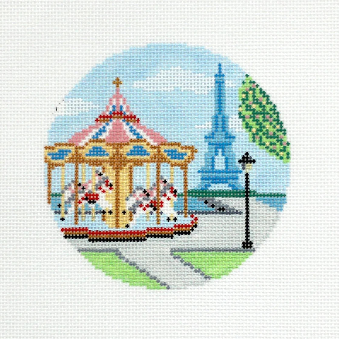 This hand painted needlepoint canvas by Morgan Julia Designs features a lovely Parisian scene with a carousel.