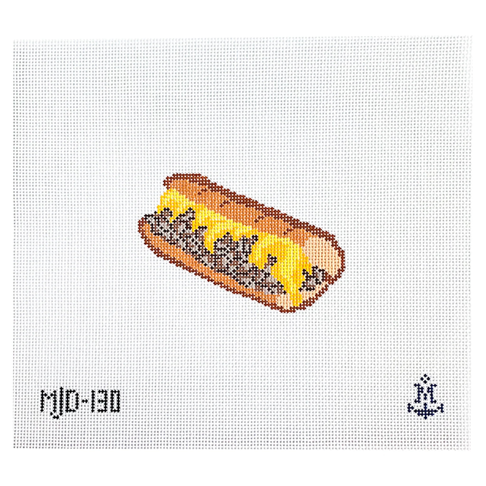 This hand painted needlepoint canvas by Morgan Julia features a cheesy Philly cheesesteak.