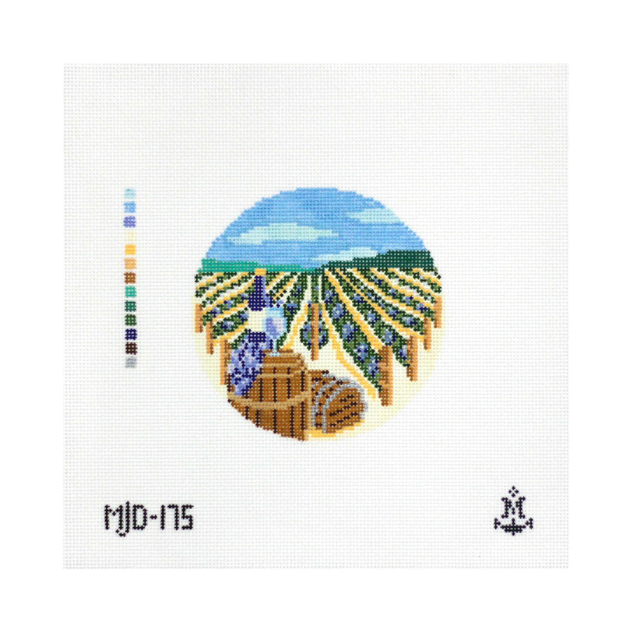 This hand painted needlepoint canvas by Morgan Julia features a scene from a winery with rows of vines.