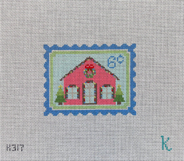 This hand painted needlepoint canvas from Ndlpt Designs features vintage stamp inspired design with a pink house decorated for the holidays.