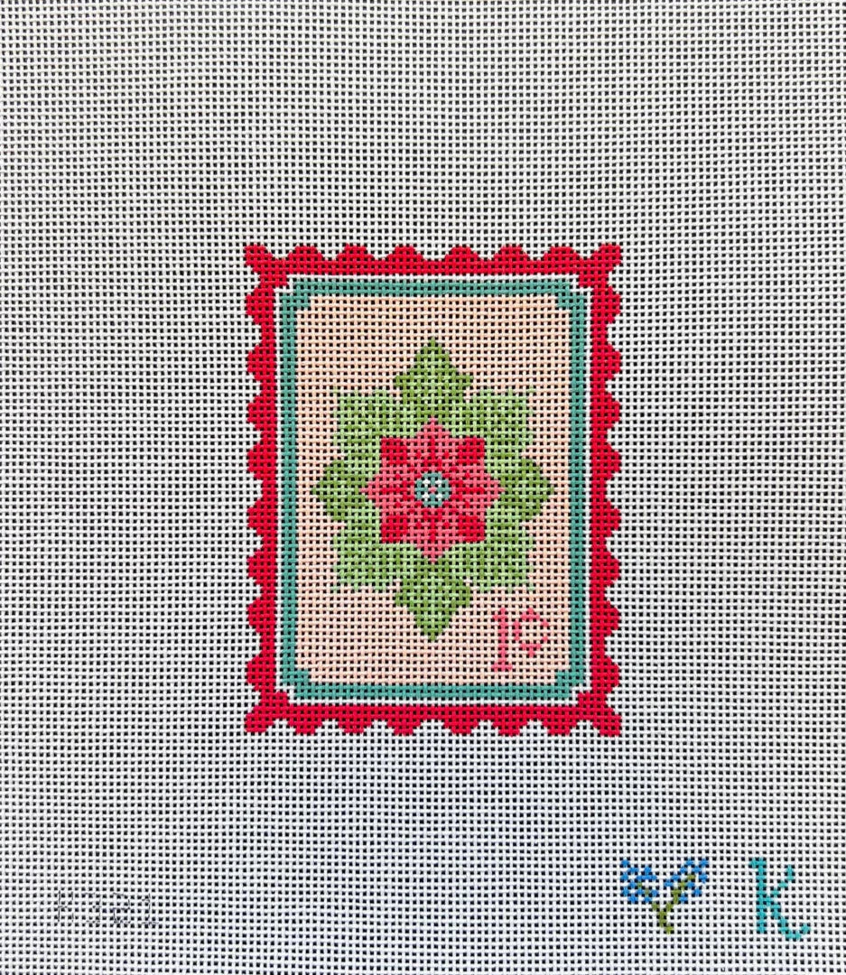 This hand painted needlepoint canvas from Ndlpt Designs features vintage stamp inspired design with a poinsettia flower.