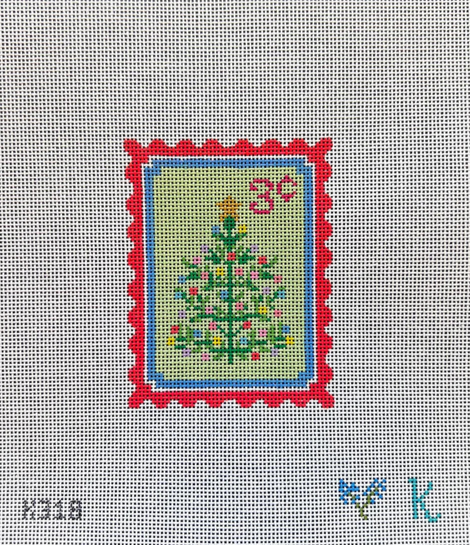 This hand painted needlepoint canvas from Ndlpt Designs features vintage stamp inspired design with a Christmas tree.
