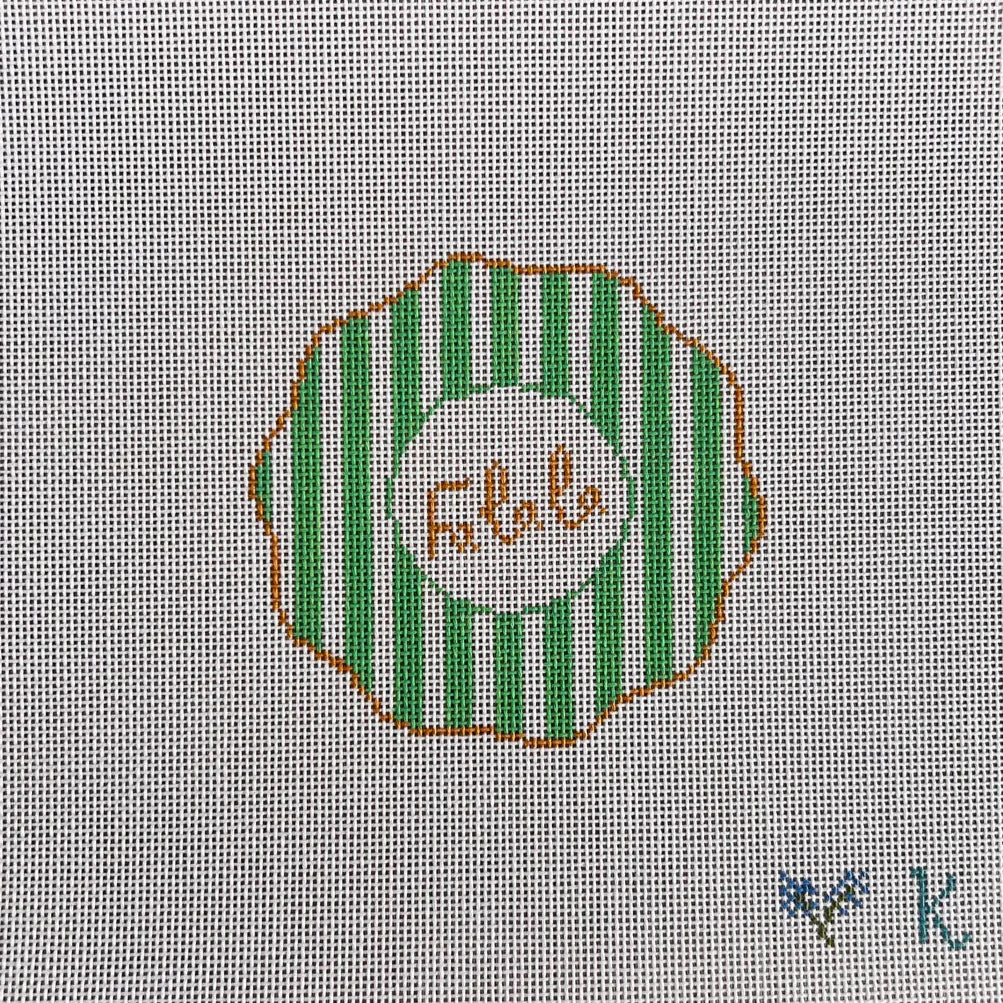 This hand painted needlepoint canvas from Ndlpt Designs features a vintage inspired striped design with "Fa la la" in the center.