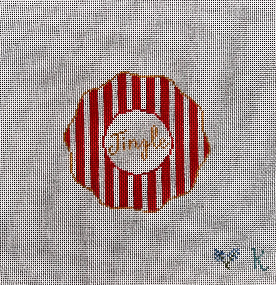 This hand painted needlepoint canvas from Ndlpt Designs features a vintage inspired striped design with "Jingle" in the center.