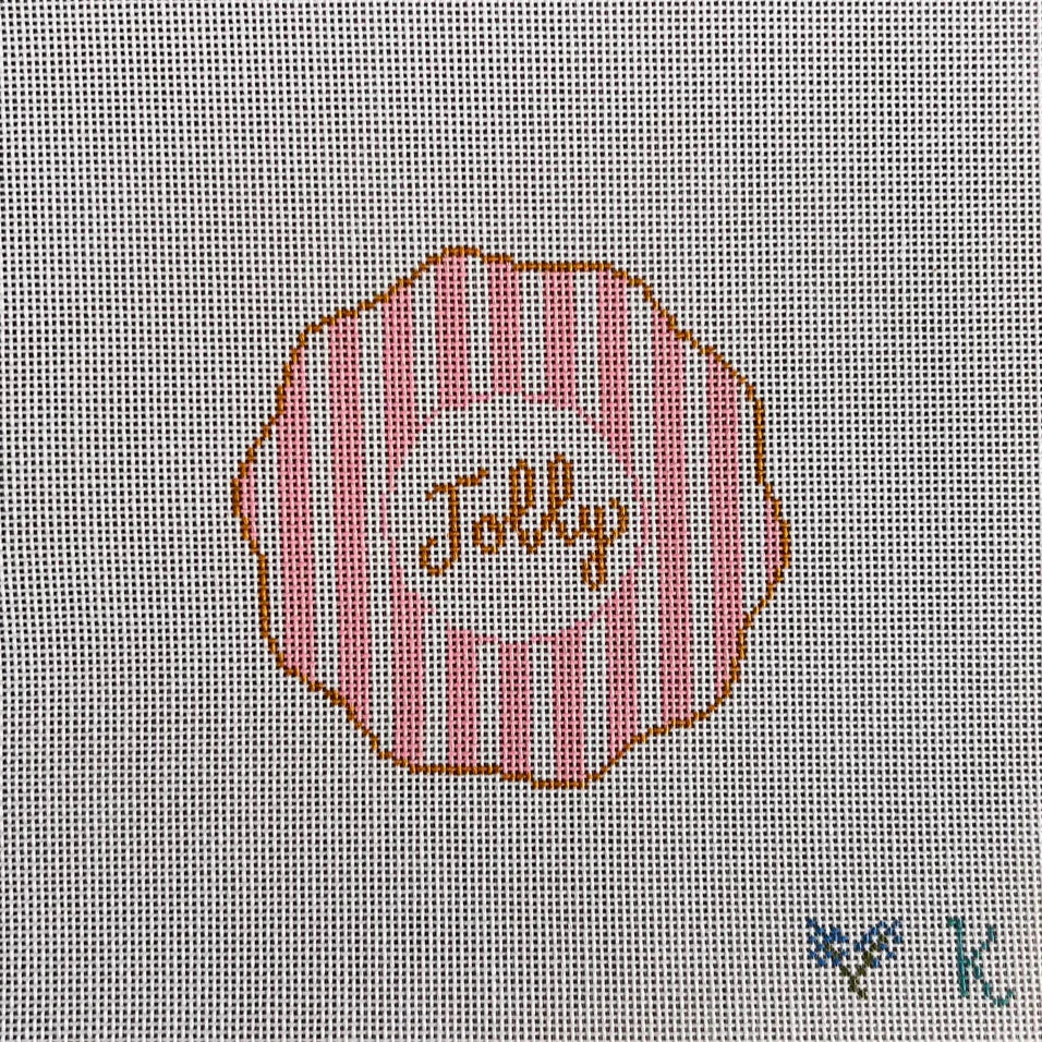 This hand painted needlepoint canvas from Ndlpt Designs features a vintage inspired striped design with "Jolly" in the center.