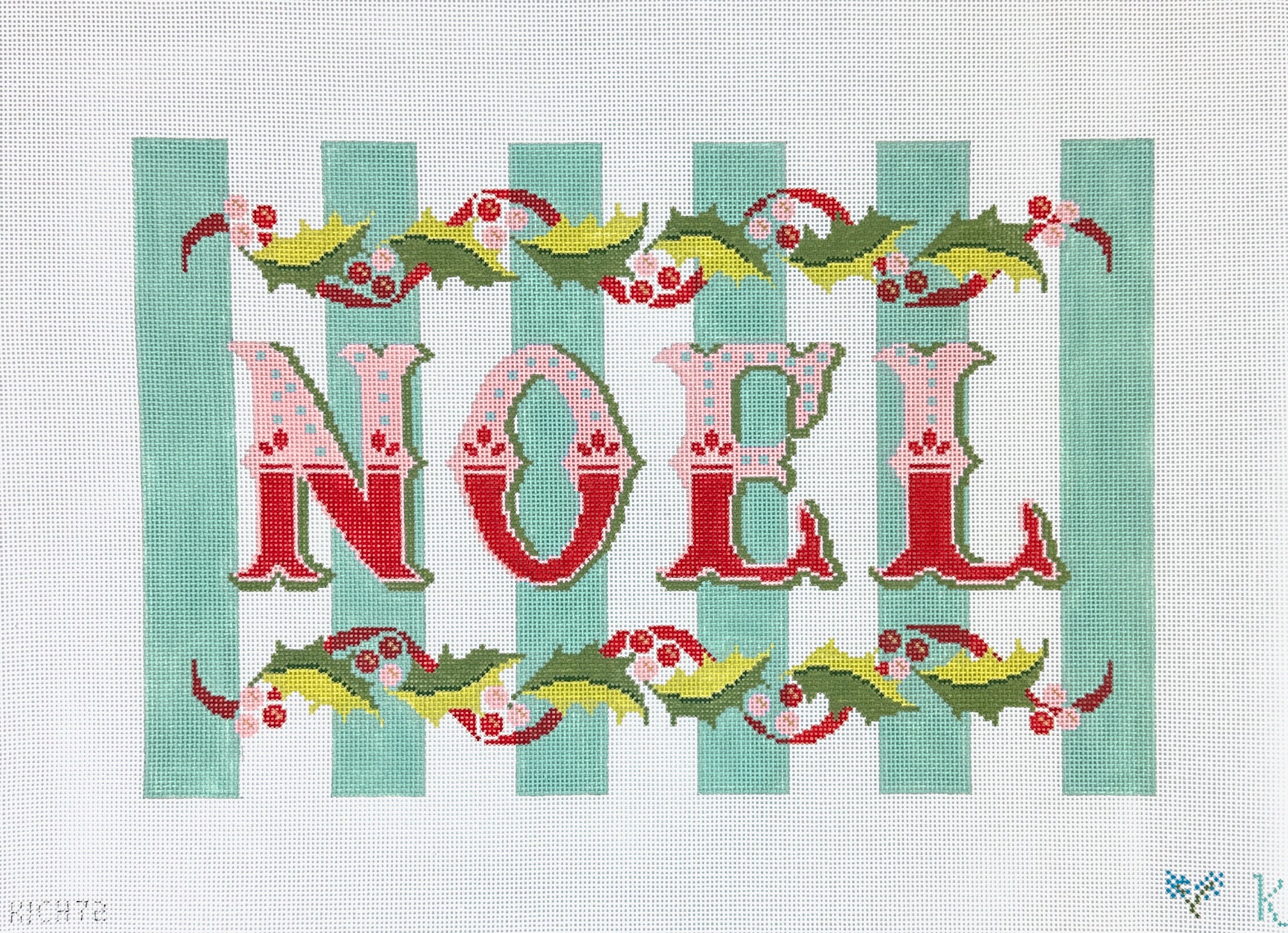 This hand painted needlepoint canvas by Ndlpt Designs features a vintage inspired Noel on striped background.