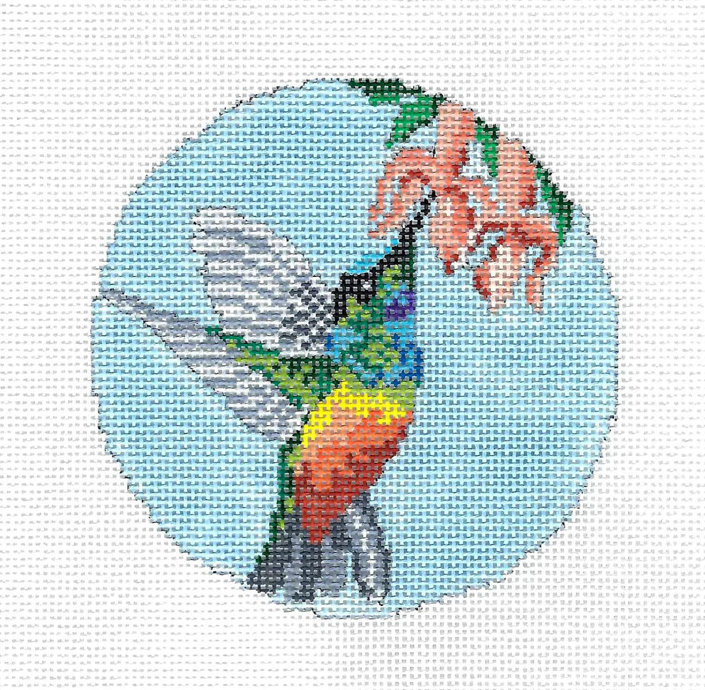 This is a hand painted needlepoint canvas by Needle Crossings, featuring a gold-bellied hummingbird and a flower on a blue background.
