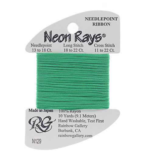 This is Neon Rays from Rainbow Gallery in color 129 Light Christmas Green. A shiny rayon ribbon that is excellent for creating metallic and porcelain textures. Works to great effect with long stitches. Use as-is on all sizes.