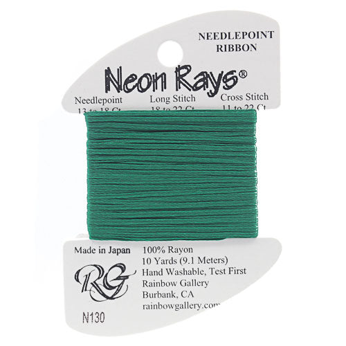 This is Neon Rays from Rainbow Gallery in color 130 Dark Christmas Green. A shiny rayon ribbon that is excellent for creating metallic and porcelain textures. Works to great effect with long stitches. Use as-is on all sizes.