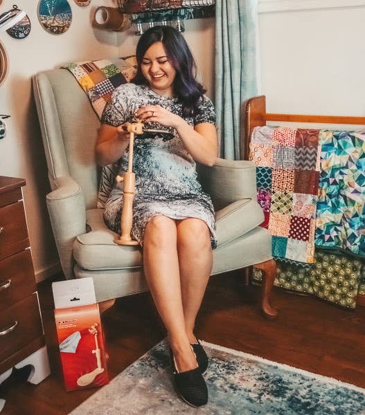 The Nurge adjustable embroidery seat stand 190-1 is made from hard beechwood, finely sanded, and polished for a super smooth natural wood finish. They are the crafter's choice for quality. It is a height-adjustable joint (minimum height 32cm ( 12.6"), maximum height 48cm (19"). The ideal embroidery stand to take on holiday if you don't want to leave your stitching at home!