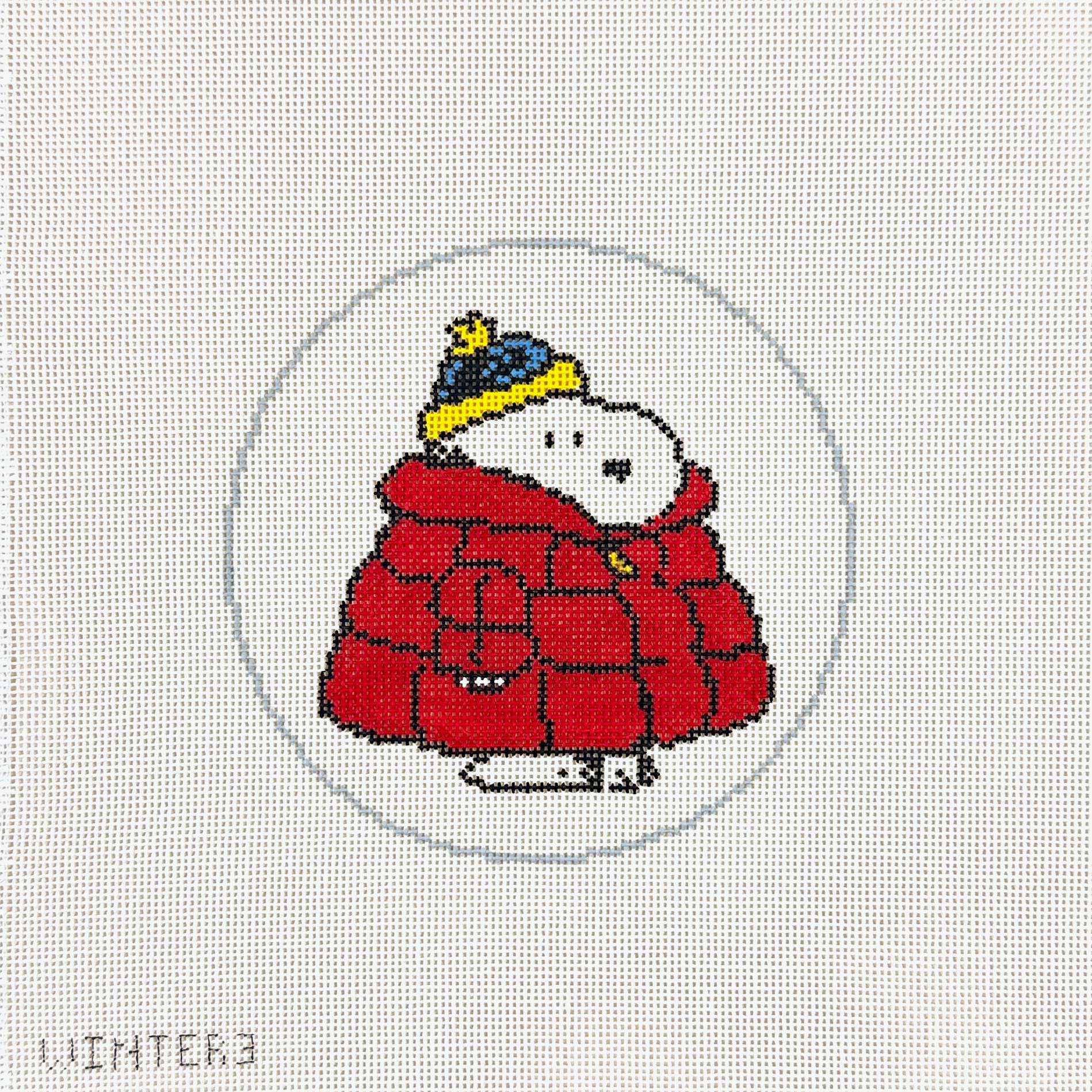 This is a hand painted needlepoint canvas by Officially Needlepoint. It features the Peanuts' character, Snoopy, in a large red puffer coat.