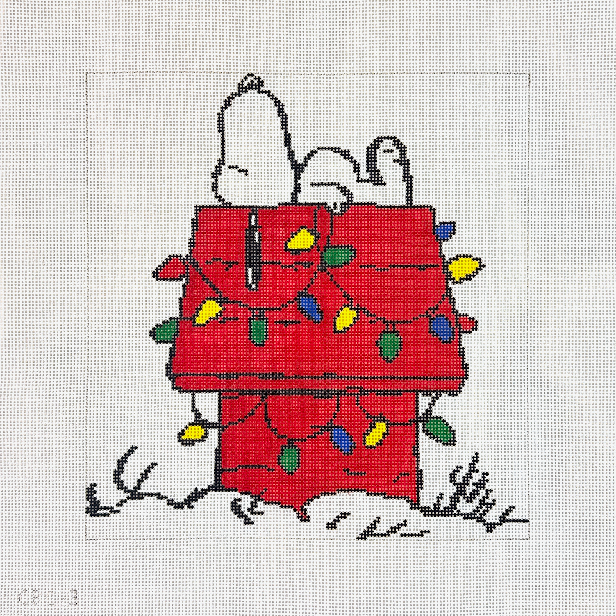 This is a hand painted needlepoint canvas by Officially Needlepoint. It features the Peanuts' characters, Snoopy, laying on his iconic red doghouse, which has been wrapped in festive Christmas lights.