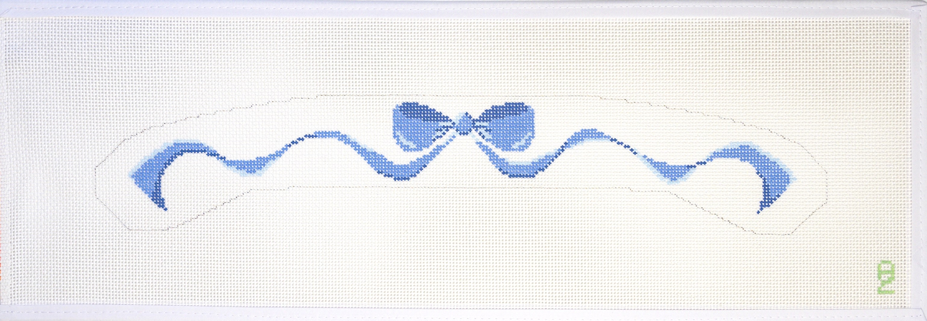 This is a needlepoint canvas from Oz Needle and Thread. It features a hanger design with a blue bow.