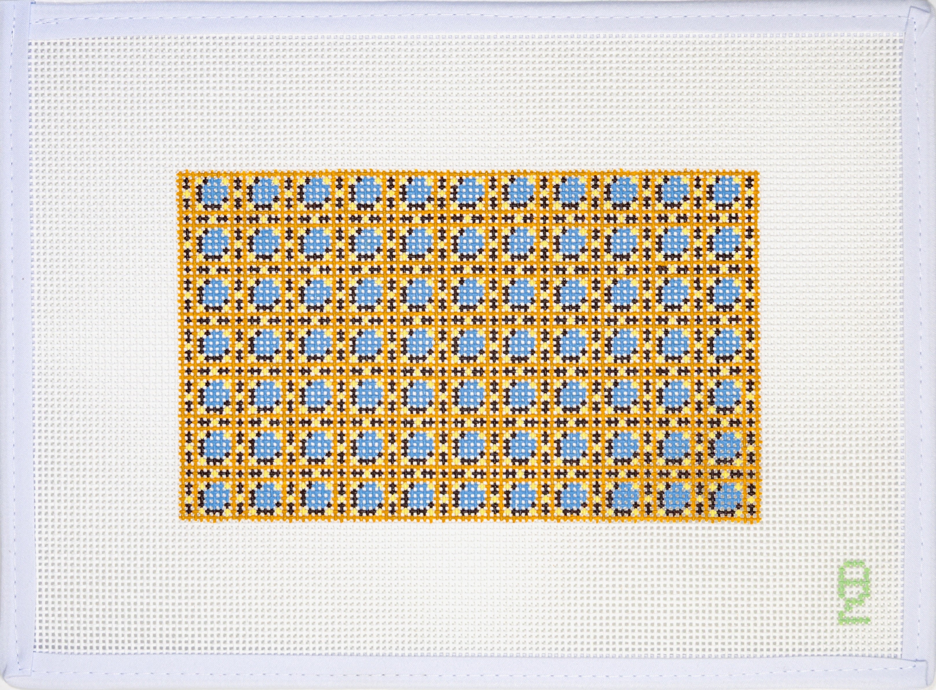 This is a needlepoint canvas from Oz Needle and Thread. It features a blue cane patterned canvas, and is intended to be finished as a glasses case.