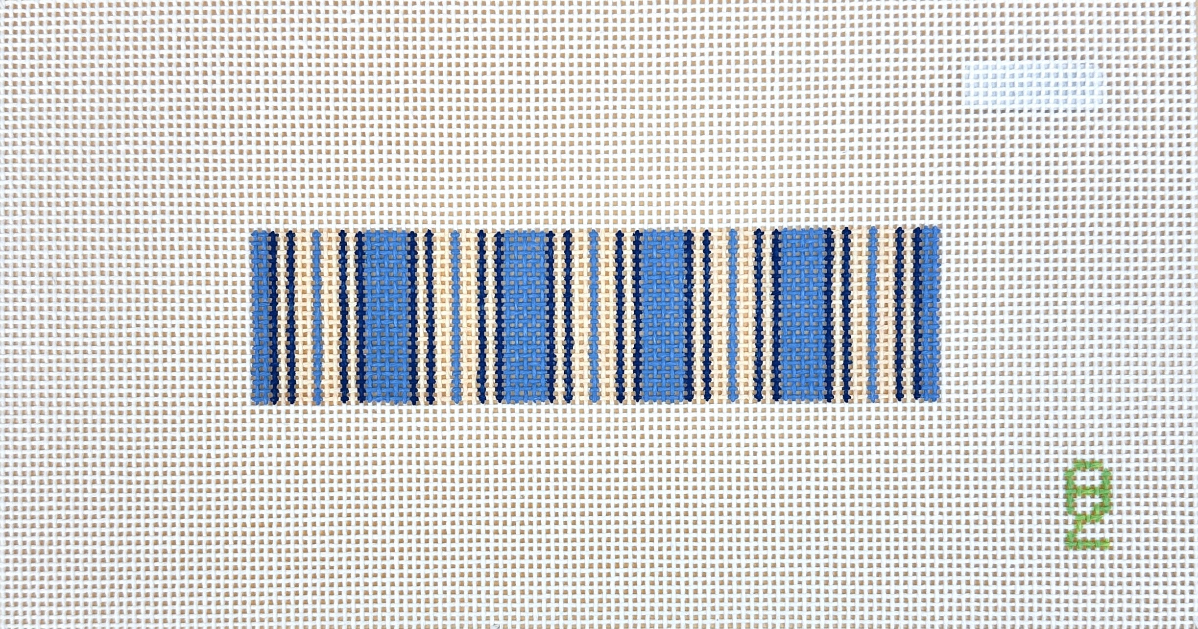 This is a needlepoint canvas from Oz Needle and Thread. It features a blue ticking patterned canvas, and is intended to be finished as a key fob.