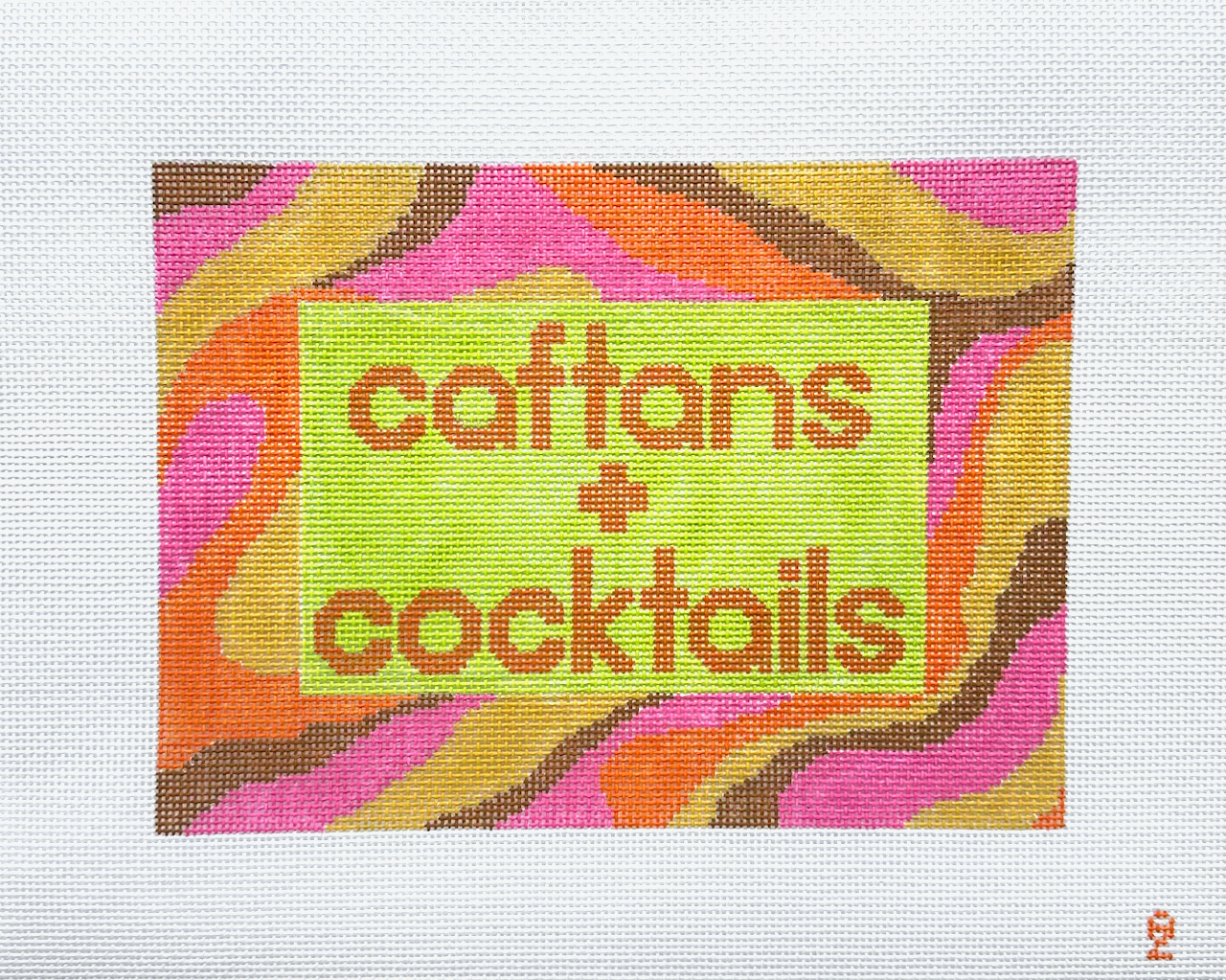 This hand painted needlepoint canvas by Oz Needle and Thread features a 60's inspired design with "Caftans + Cocktails".
