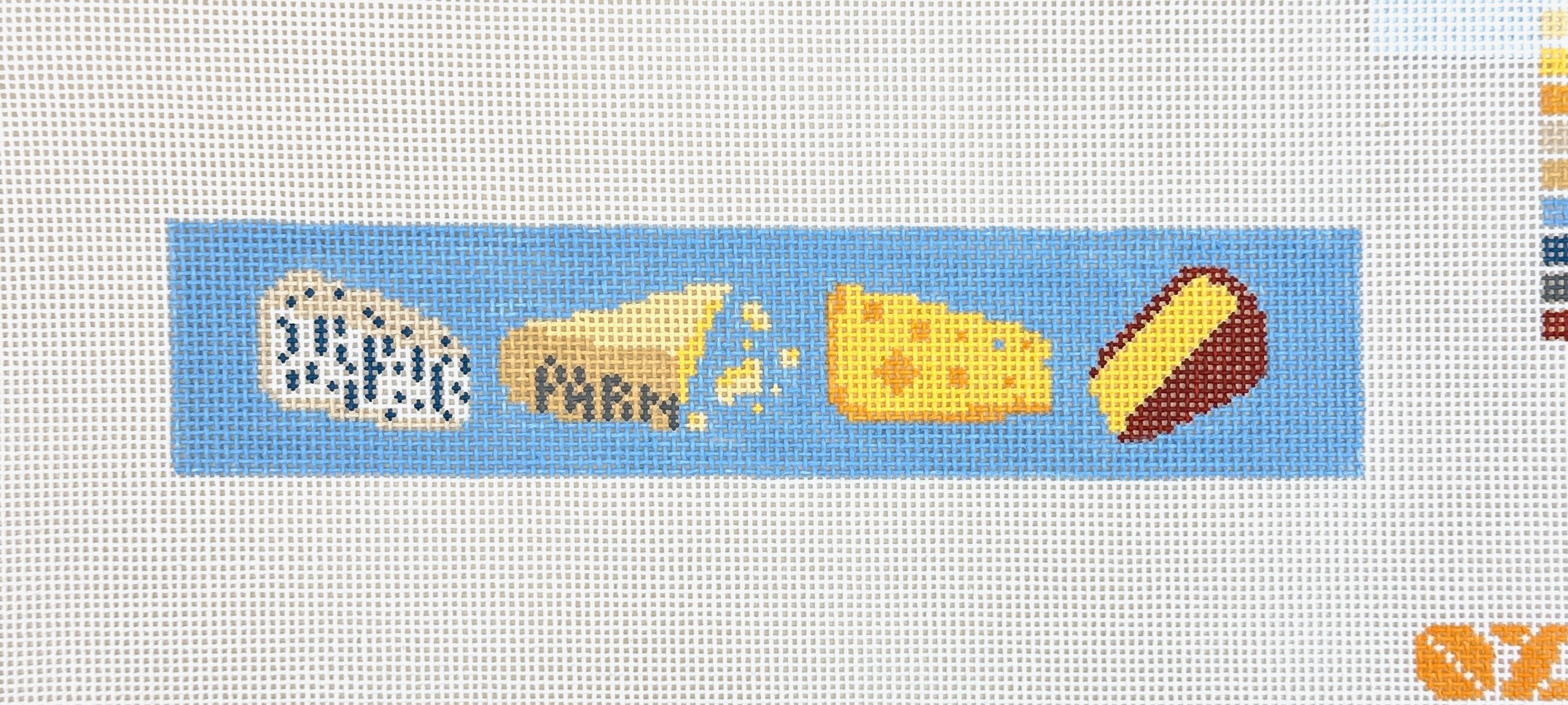 This hand painted needlepoint canvas by Oz Needle and Thread features a four kinds of cheese.