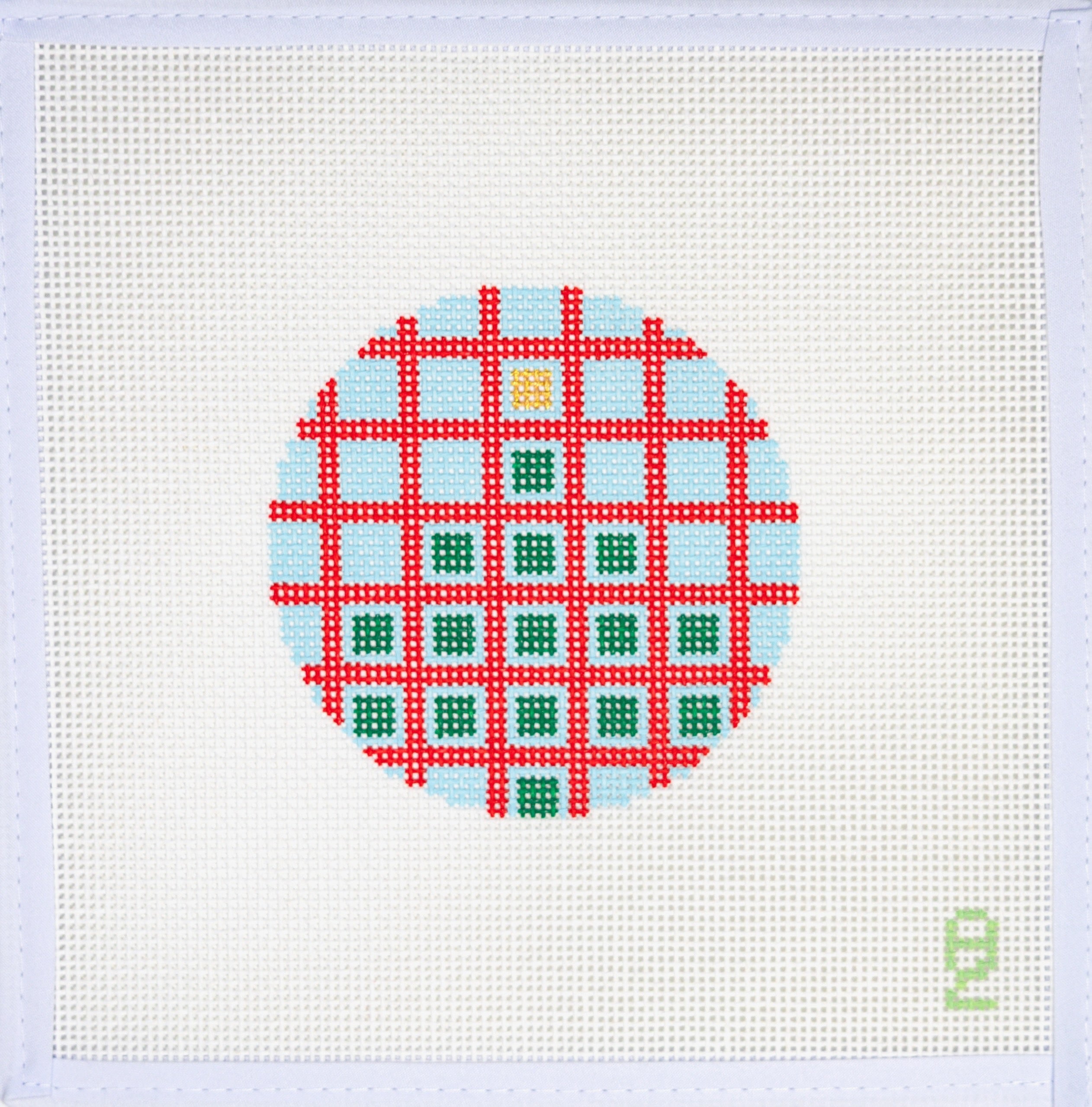 This is a needlepoint canvas from Oz Needle and Thread. It features a geometric design overlayed on a Christmas tree.