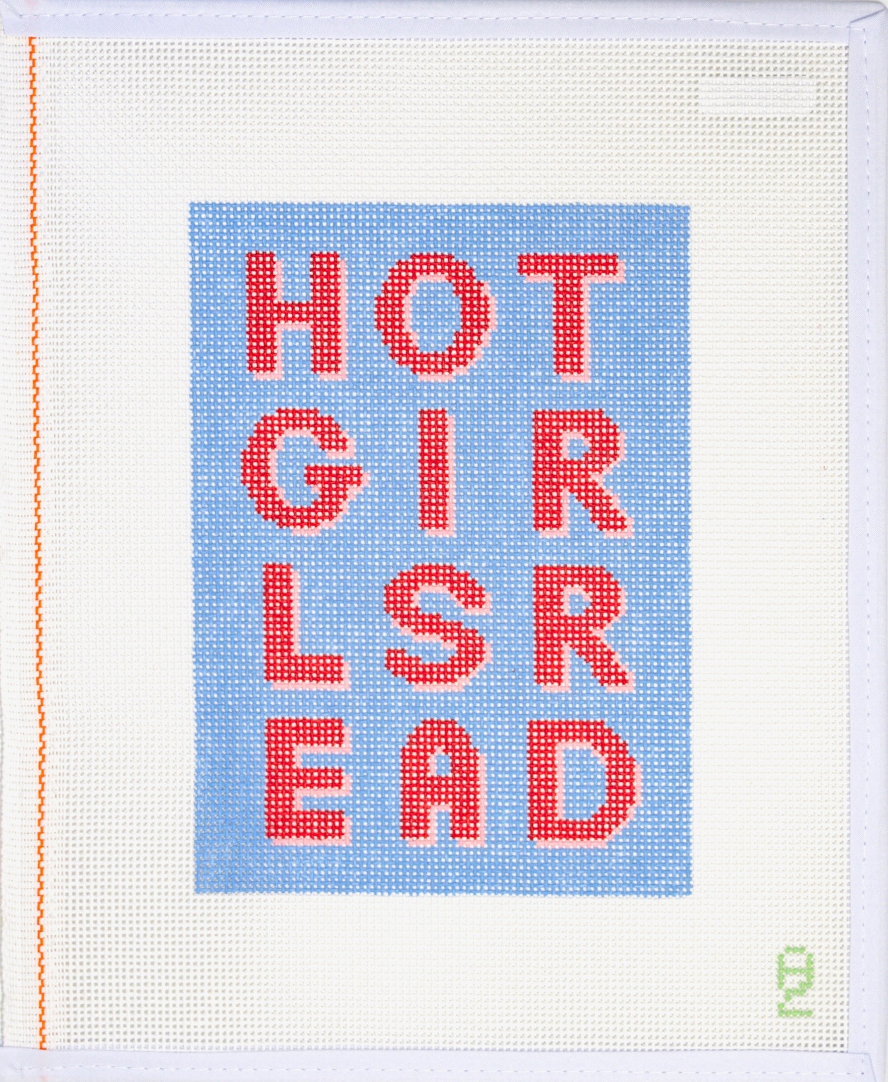This is a needlepoint canvas from Oz Needle and Thread. It features a sign which says "hot girls read".