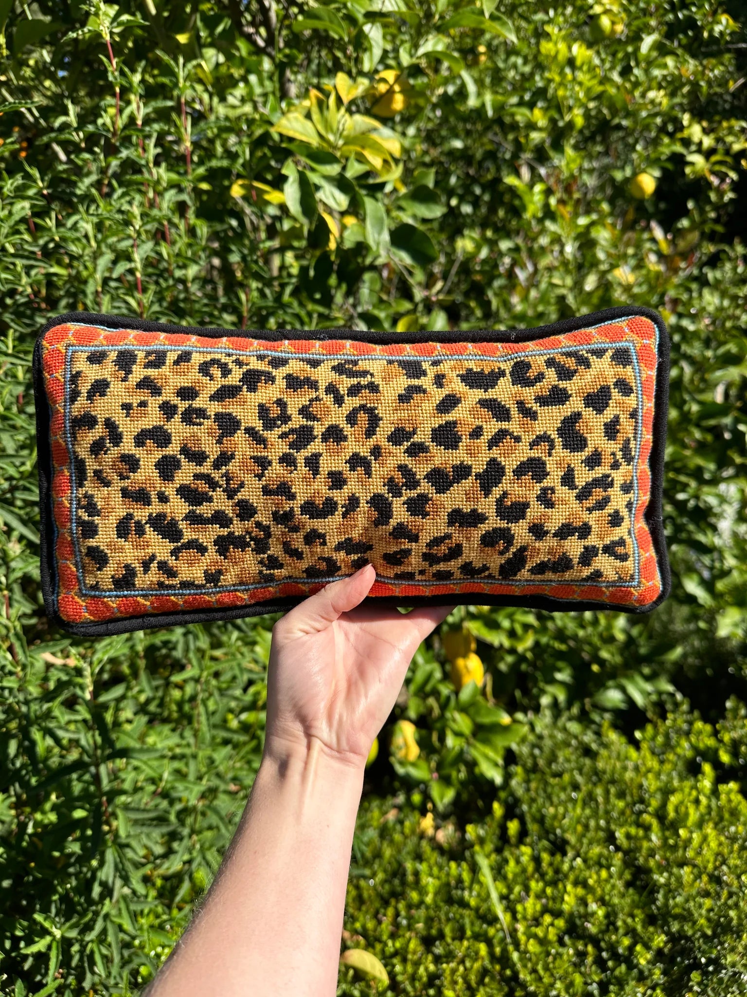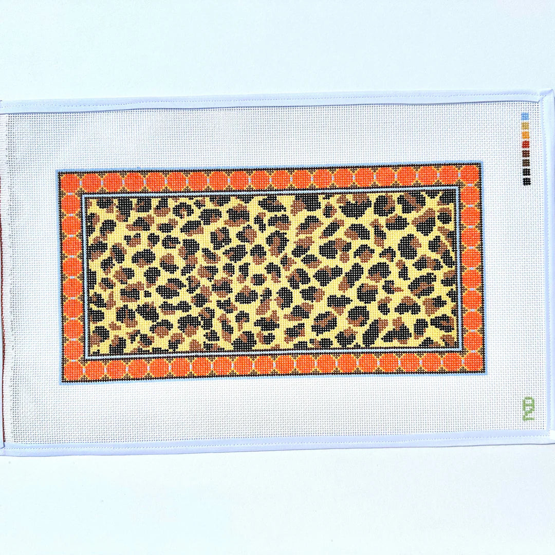 This hand painted needlepoint canvas by Oz Needle and Thread features a classic leopard pattern with orange accents. It is designed to be finished as a lumbar pillow, but would also make a chic tri-fold clutch purse.