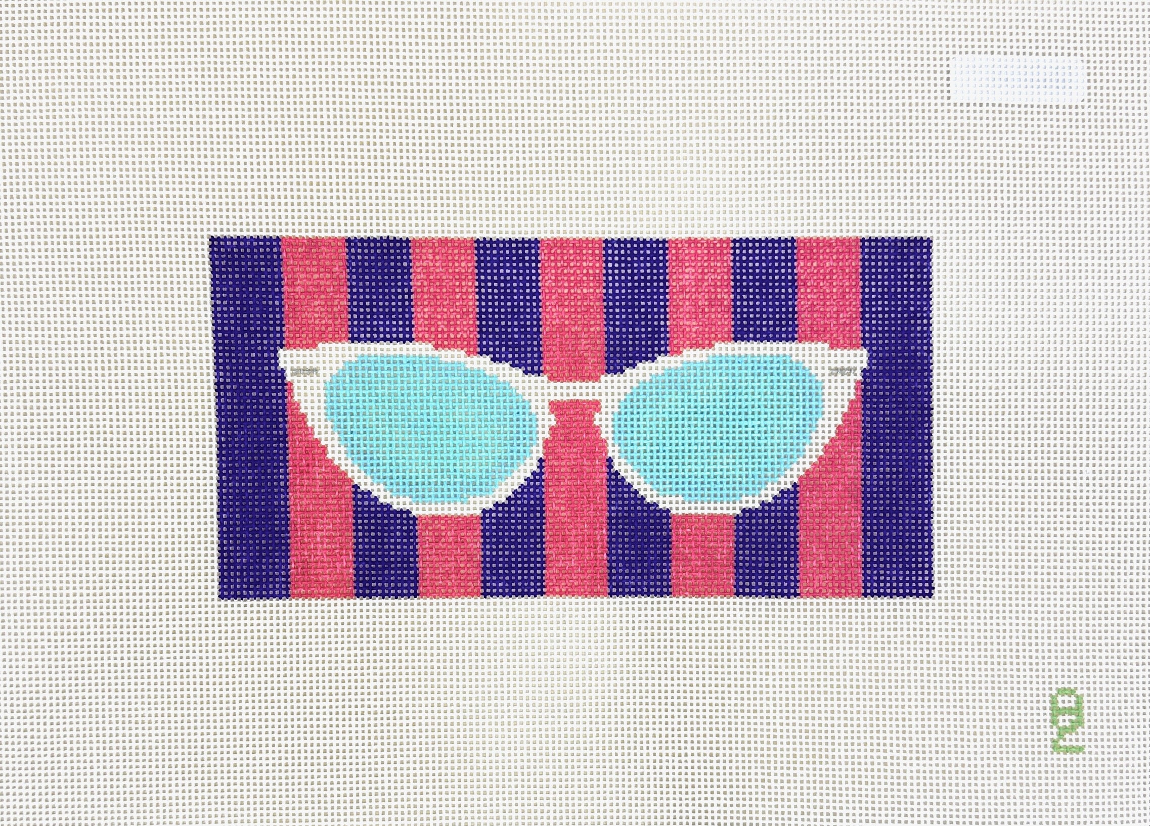 This is a needlepoint canvas from Oz Needle and Thread. It features a glasses case with a striped pattern and a pair of sunglasses laid over top.