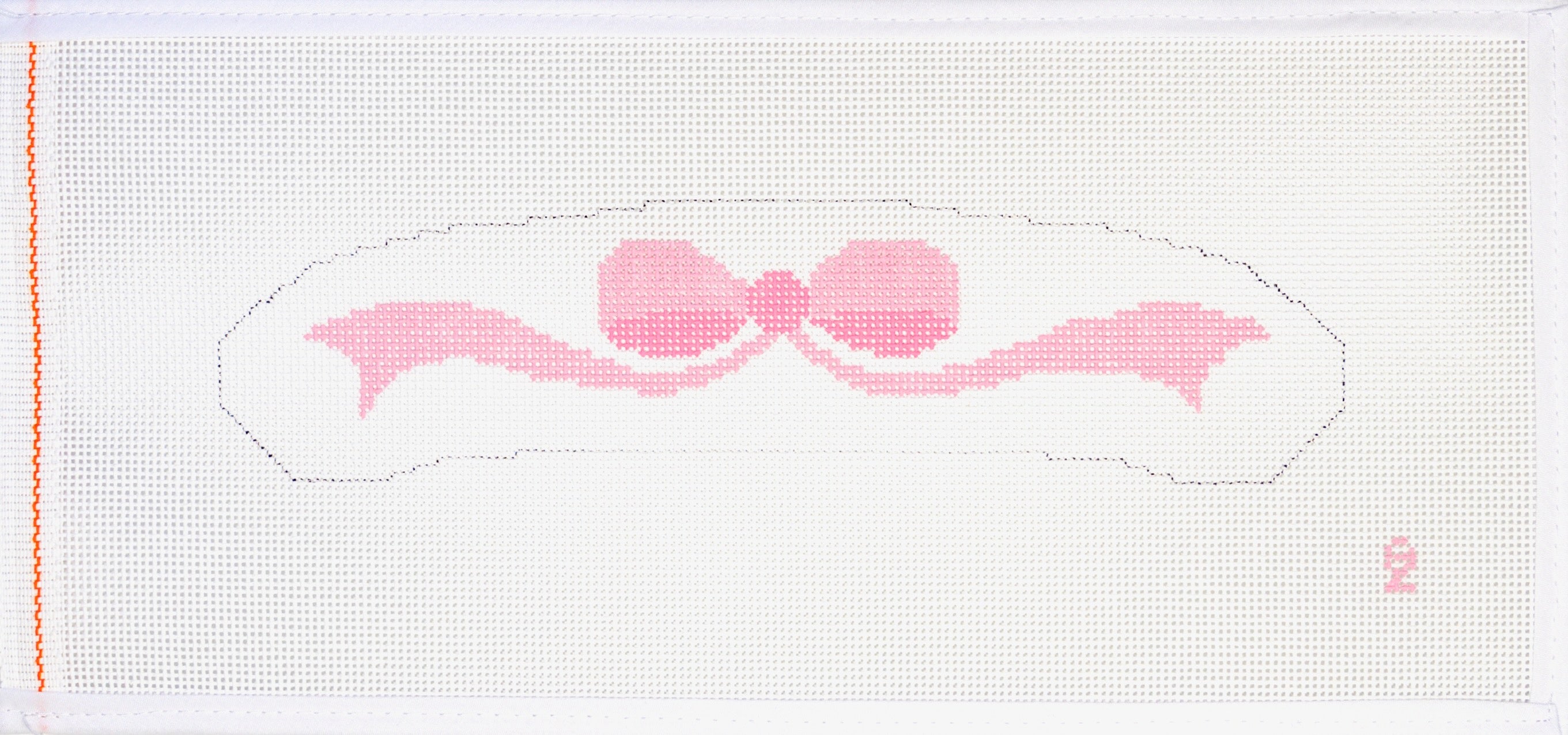 This is a needlepoint canvas from Oz Needle and Thread. It features a baby's hanger design with a pink bow.