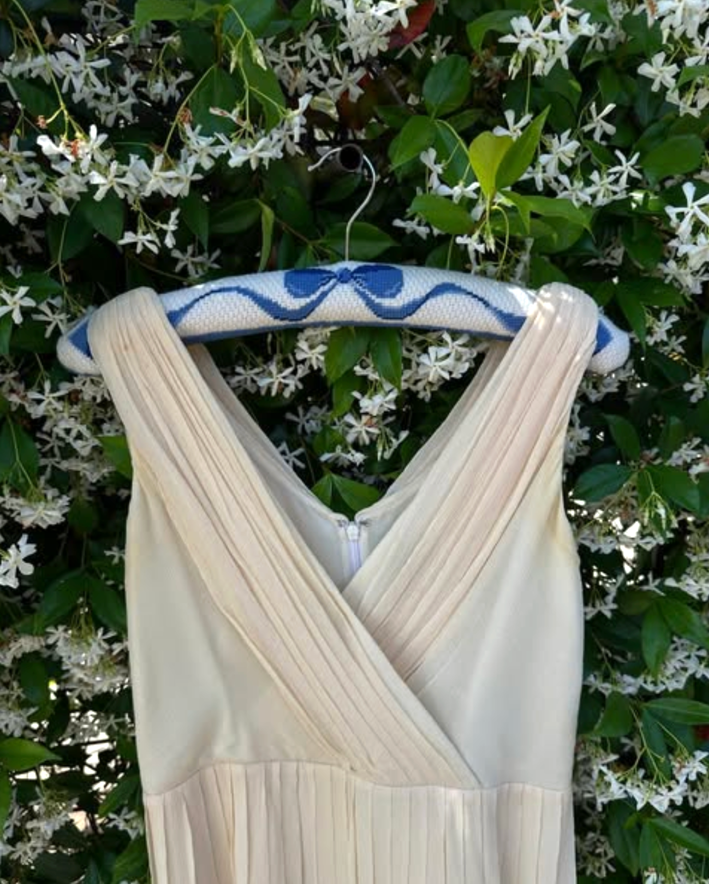 This hand painted needlepoint canvas by Oz Needle and Thread features a tiger prancing amongst a field of flowers. This canvas was designed to be finished as a padded hanger. Stitched hangers shown for inspiration, materials and finishing services sold separately.