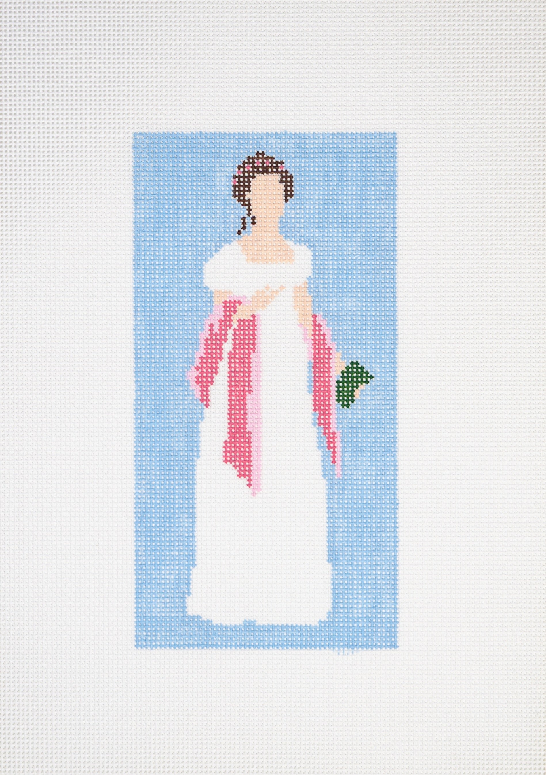 This is a needlepoint canvas from Oz Needle and Thread. It features a design for a glasses case with an old-timey woman on it.