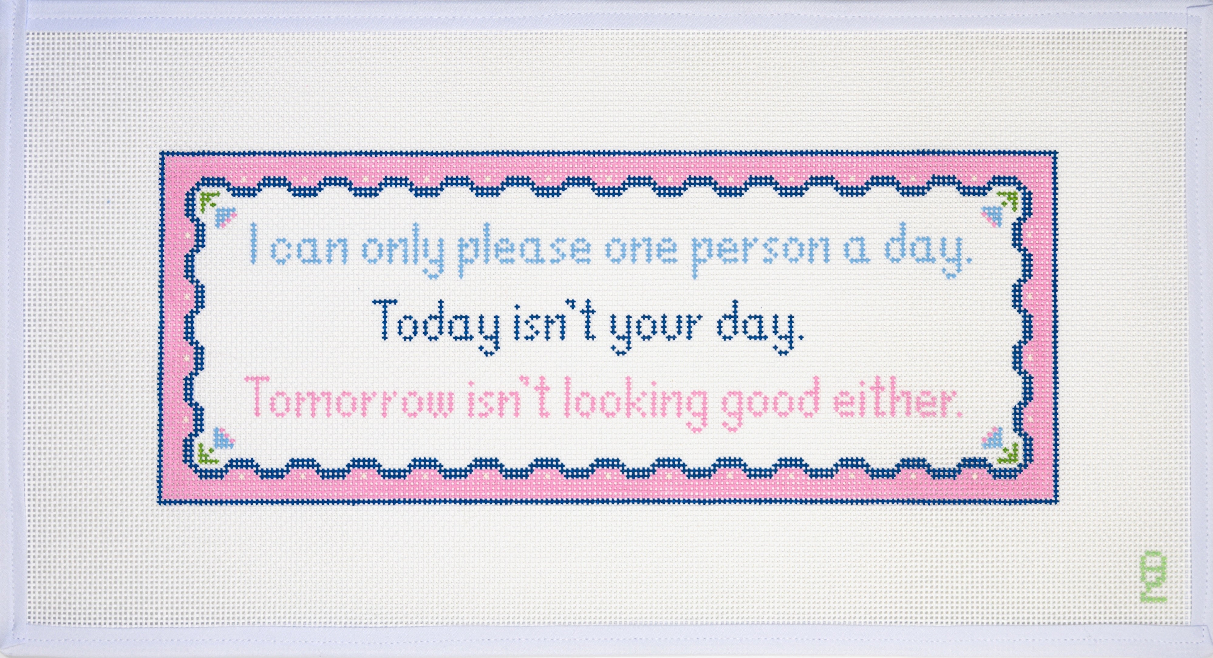 This is a needlepoint canvas from Oz Needle and Thread. It features a sign stating "Today Is Not Your Day".