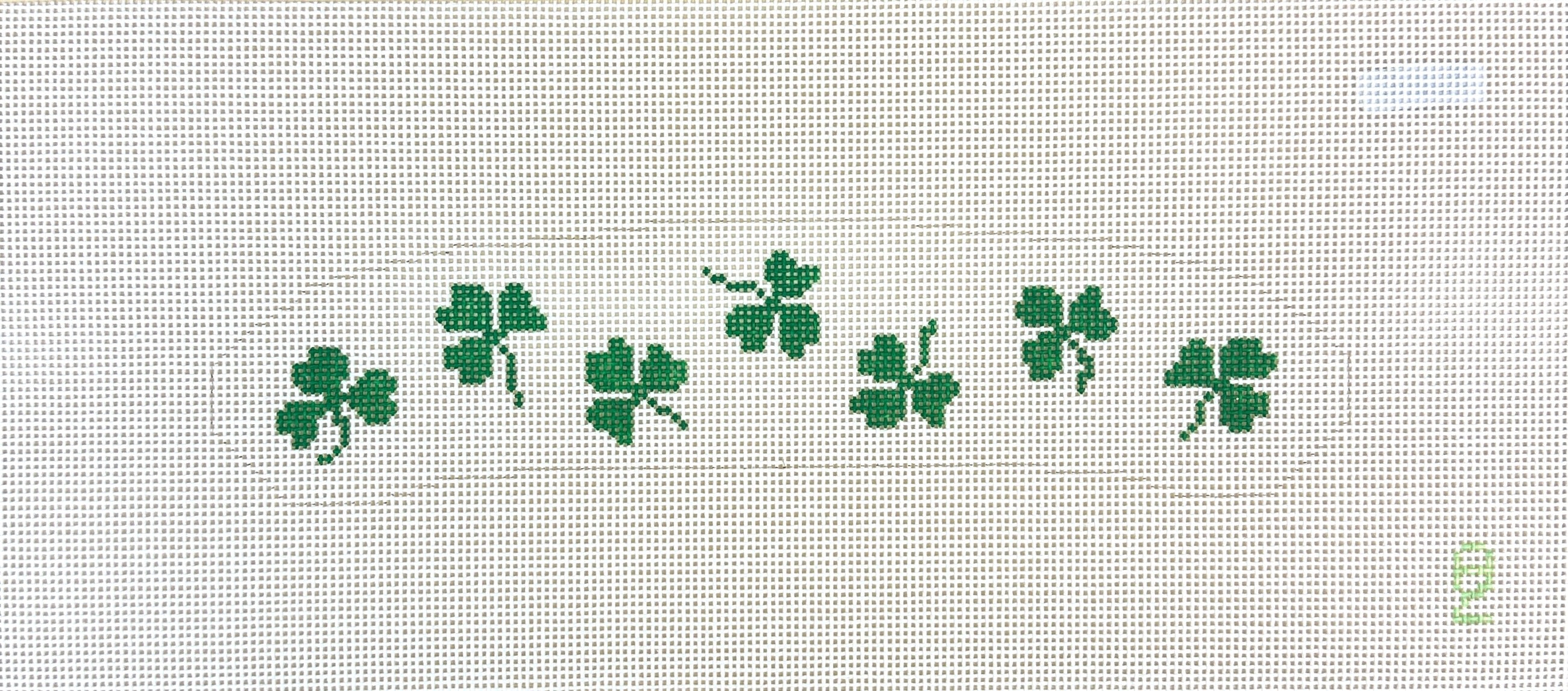 This is a needlepoint canvas from Oz Needle and Thread. It features a baby's hanger design with a shamrock tumbling along its length.