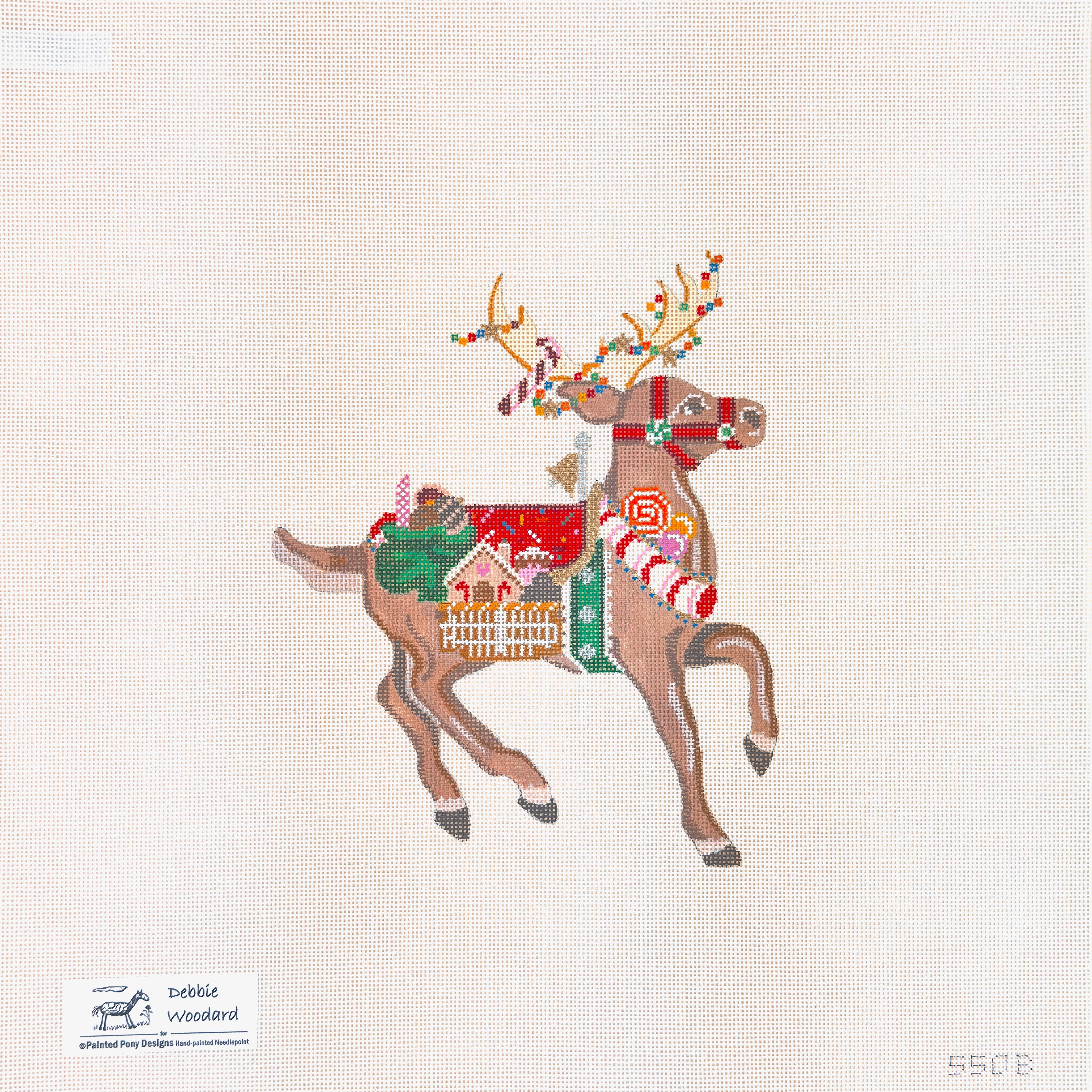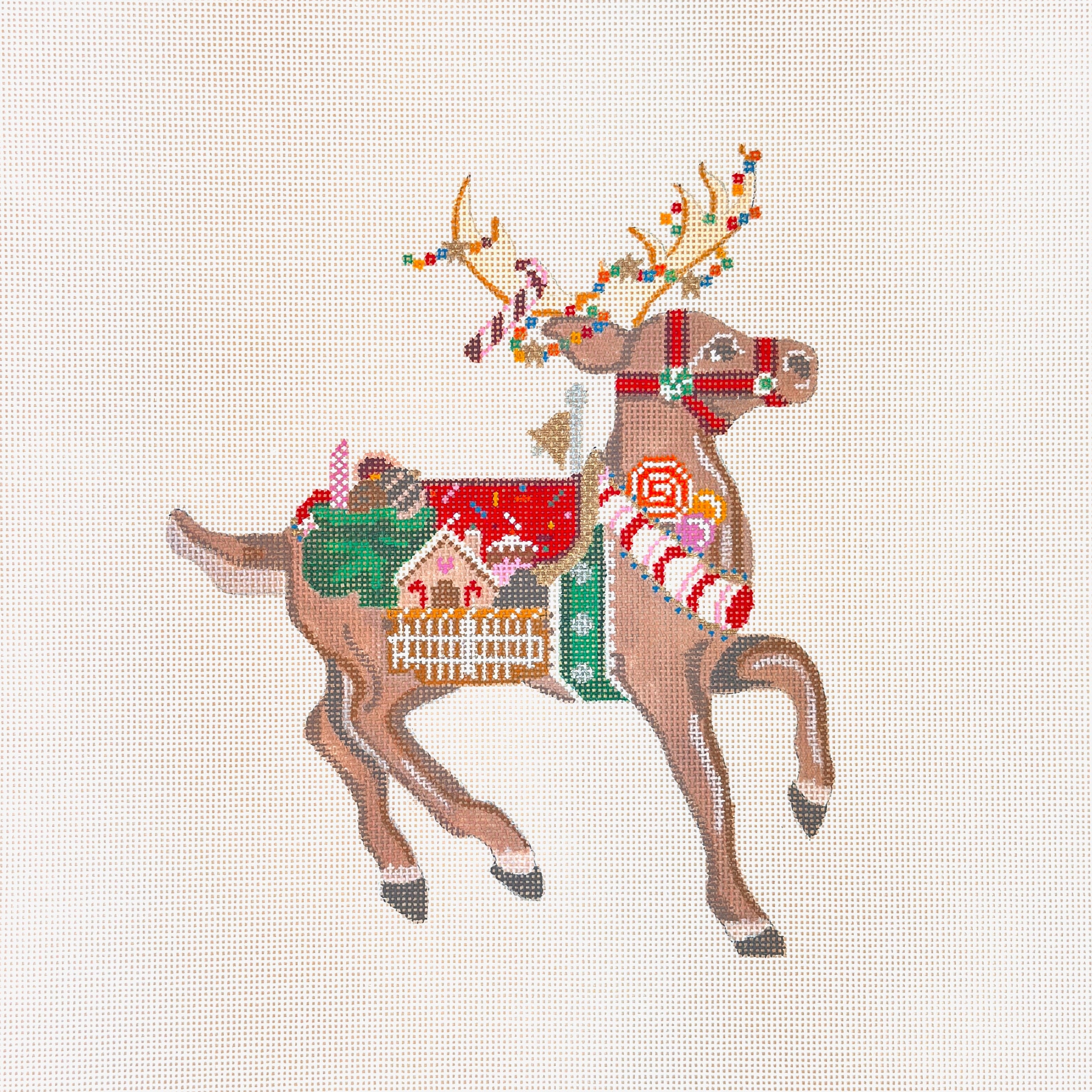 This is a hand painted needlepoint canvas by Debbie Woodward from Painted Pony Designs. It features a painting of one of Santa's reindeer.
