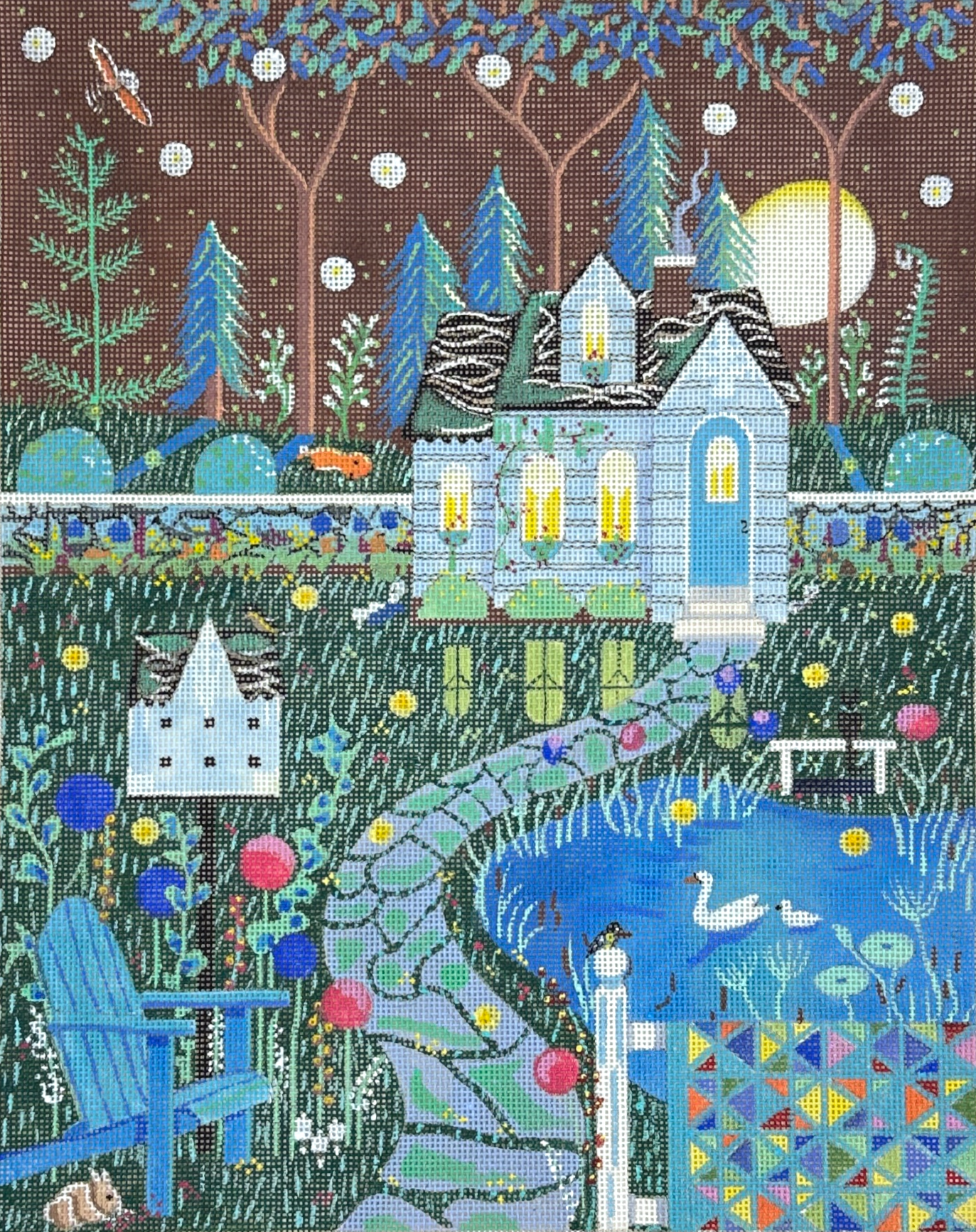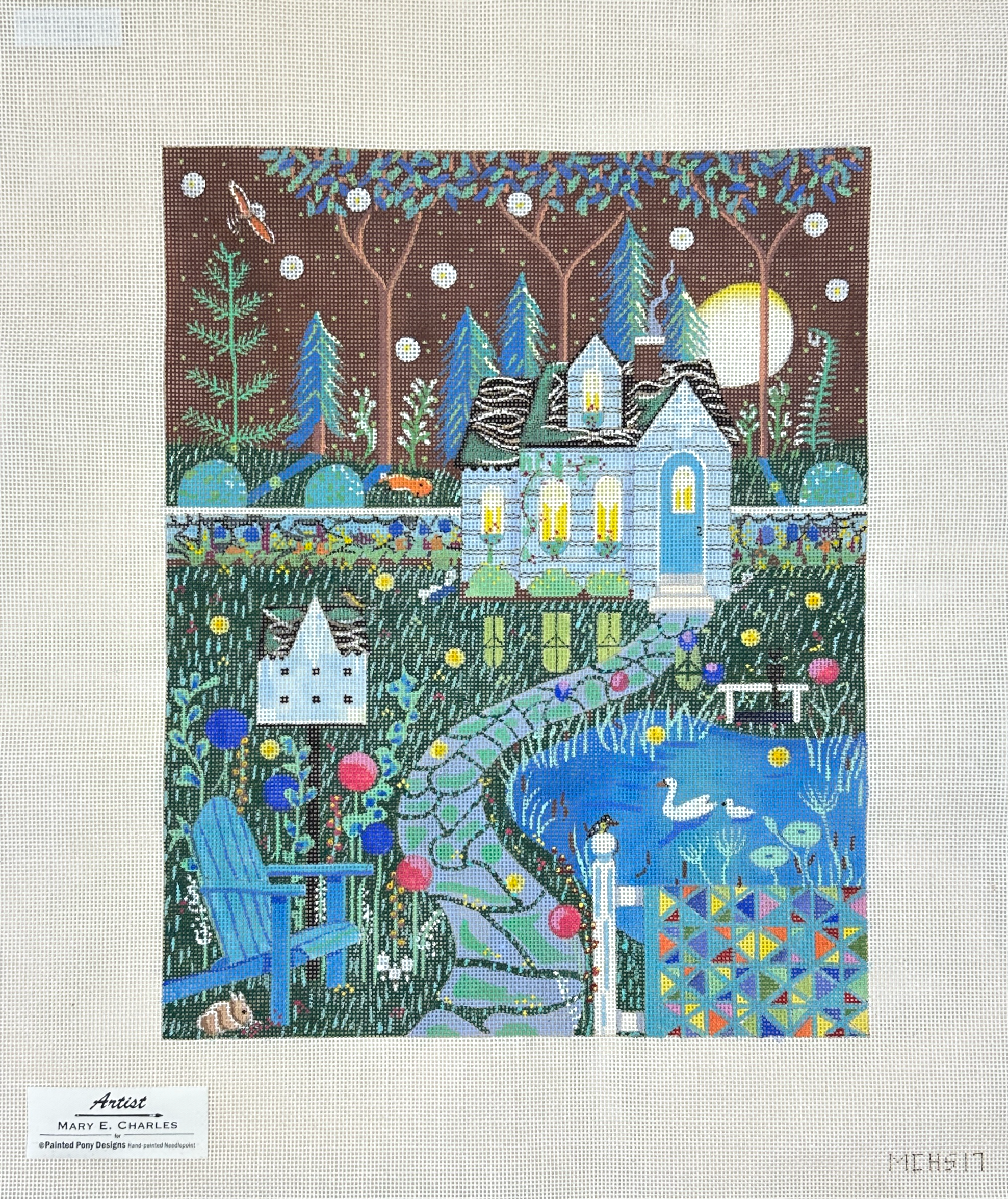 This hand painted needlepoint canvas from Mary E Charles for Painted Pony Designs features a twinkling night scene of a whimsical landscape with a lovely cottage and pond.