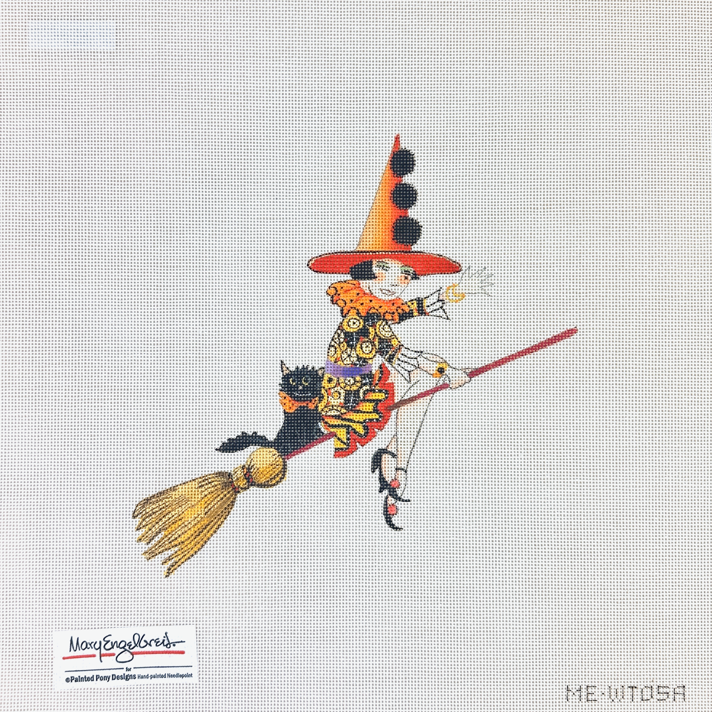 This needlepoint canvas by Mary Engelbreit from Painted Pony Designs features a witch and her cat companion riding a broomstick.
