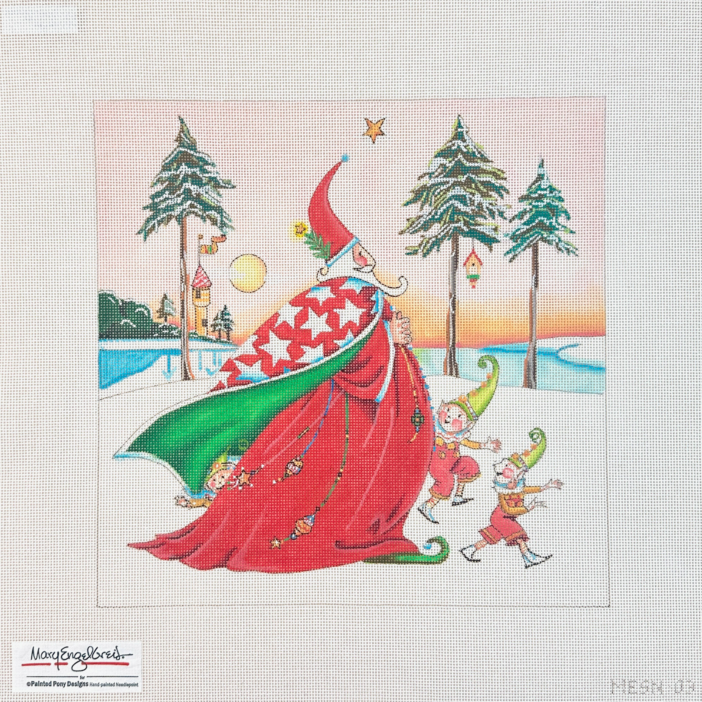 This needlepoint canvas by Mary Engelbreit from Painted Pony Designs features a particularly mystical Santa walking with his elves through the North Pole.