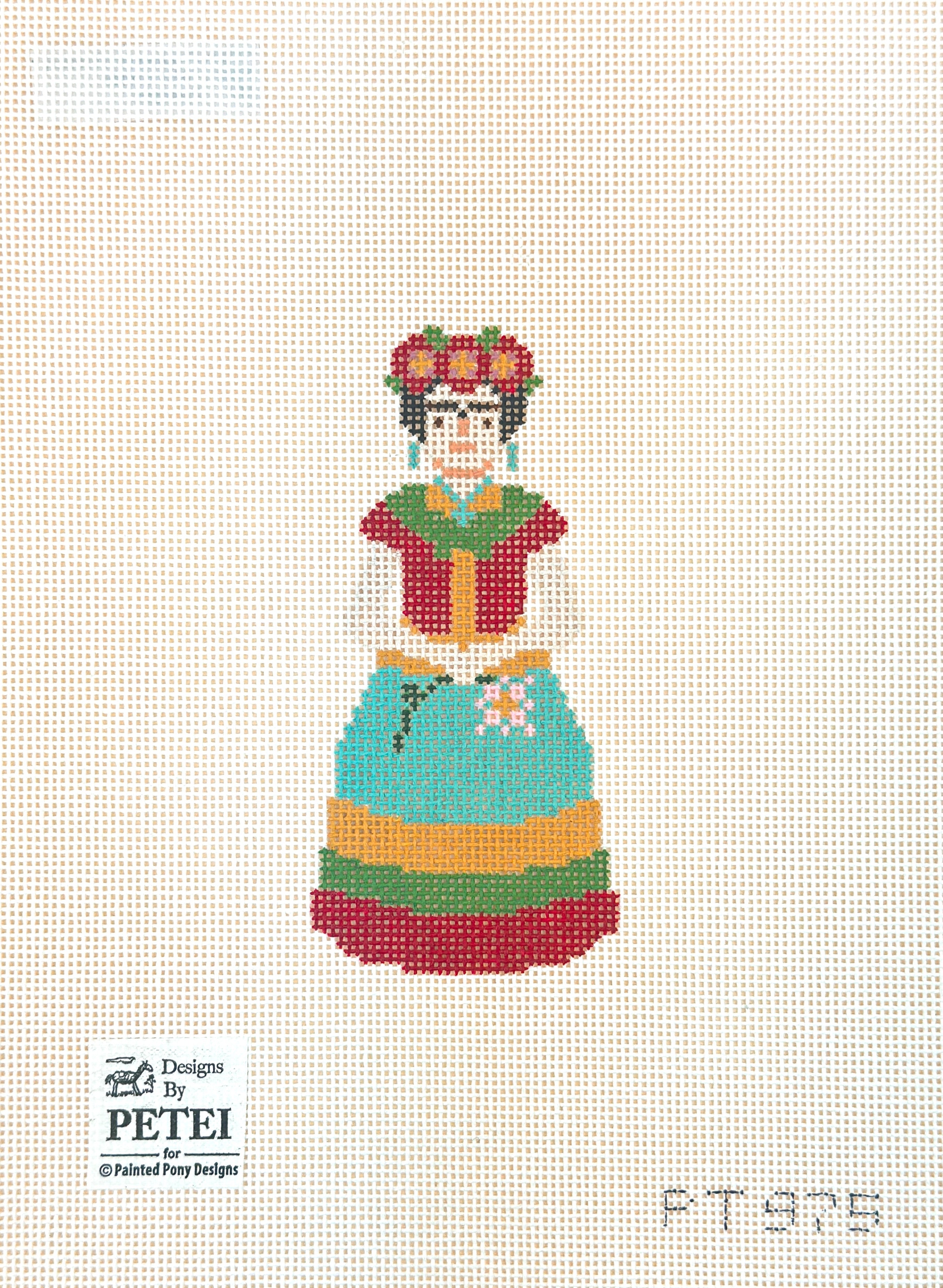 This is a hand painted needlepoint canvas by Petei Designs from Painted Pony Designs. It features a painting of Frida Kahlo.