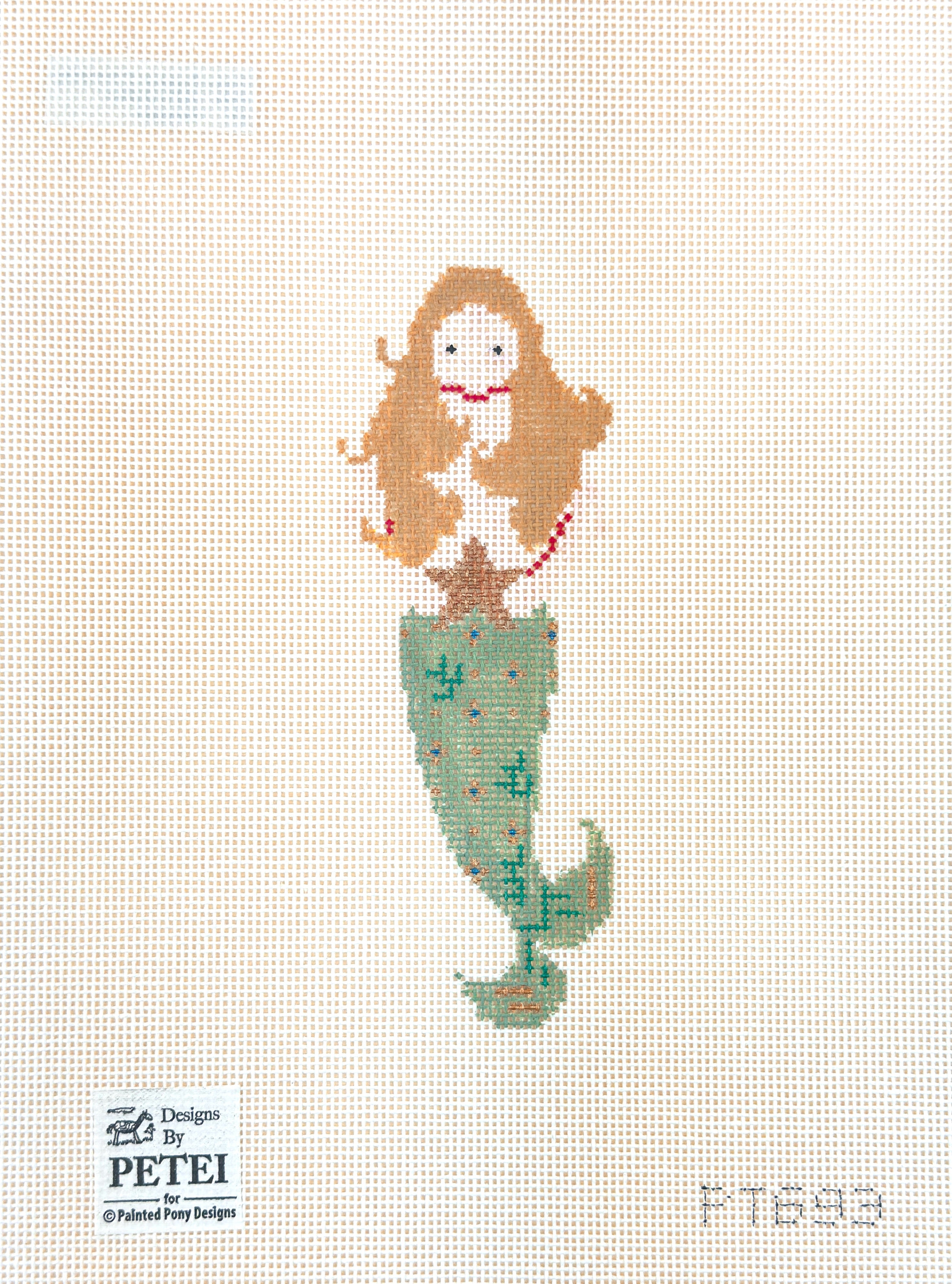 This is a hand painted needlepoint canvas by Petei Designs from Painted Pony Designs. It features a painting of a mermaid.