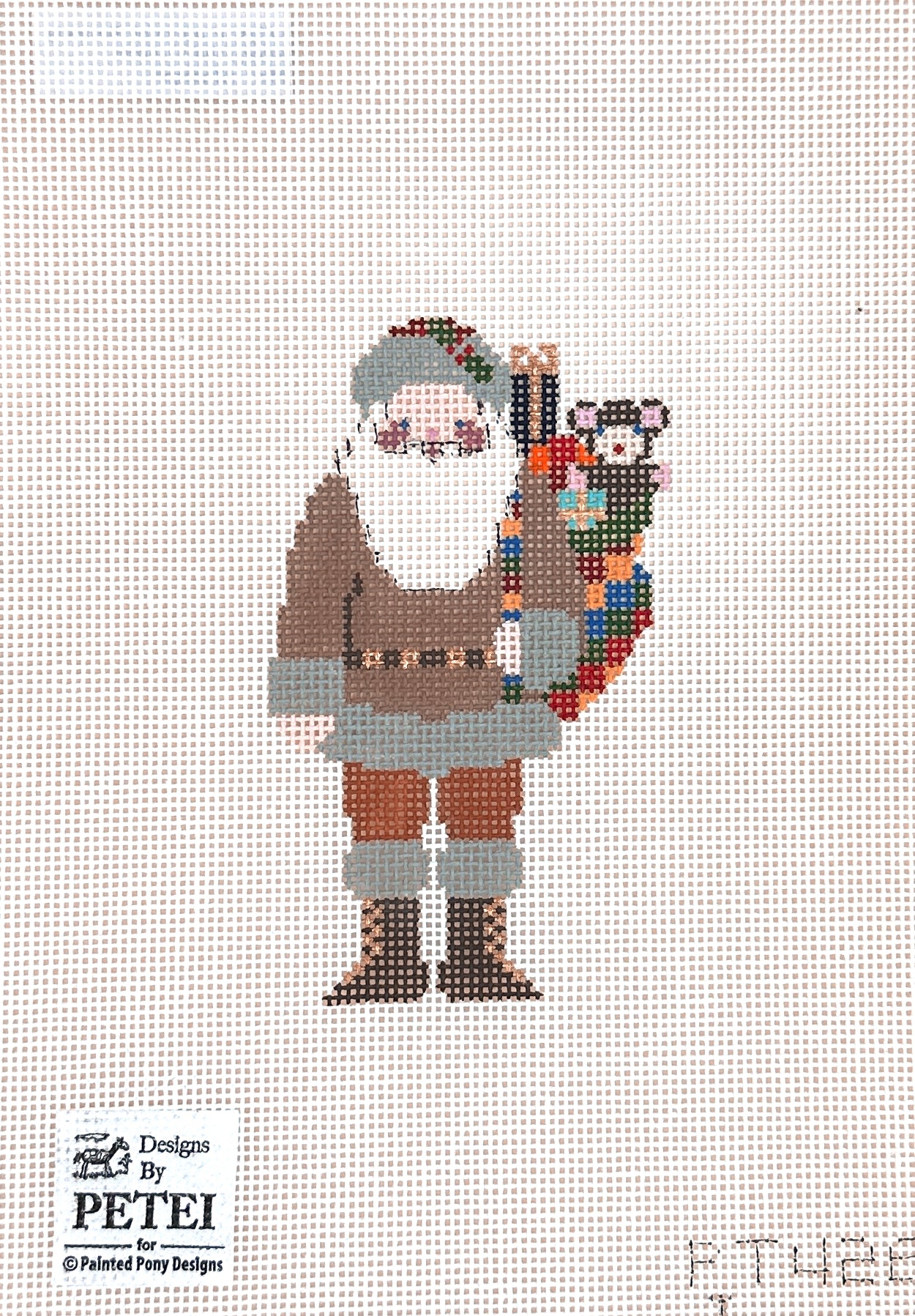 A beautiful hand painted needlepoint canvas from Painted Pony Designs by Petei Designs featuring a frontier Santa.