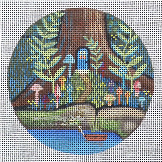 This hand painted needlepoint canvas from Mary E Charles for Painted Pony Designs features a whimsical scene with a home in a tree trunk and colorful mushrooms.
