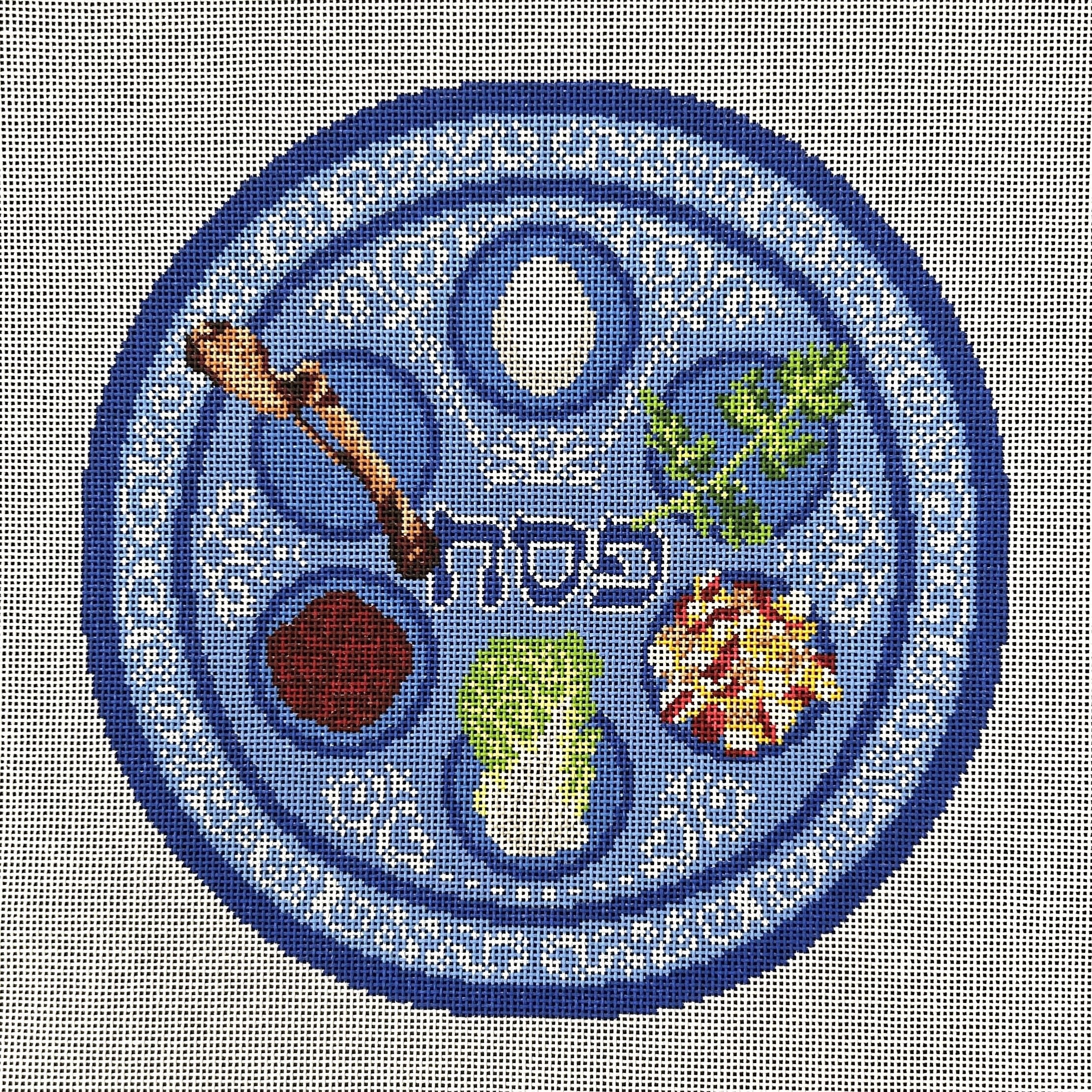 This hand painted needlepoint canvas by Rittenhouse Needlepoint features a Seder Plate with the symbolic foods eaten and displayed during the Passover Seder.